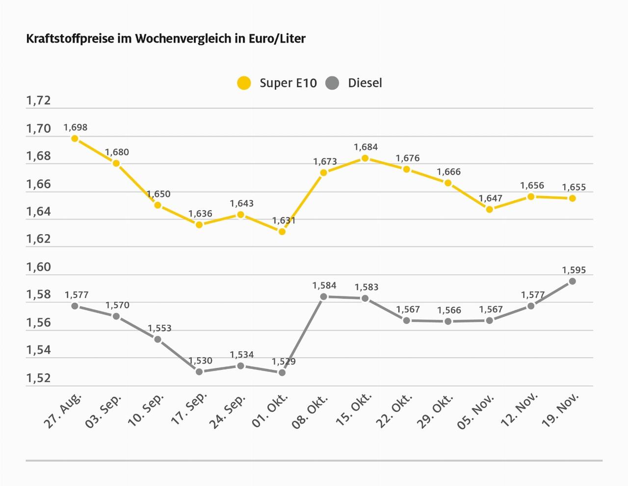 Dass Diesel in der kalten Jahreszeit teurer wird, ist nicht ungewöhnlich, denn es handelt sich um nahezu das gleiche Produkt wie Heizöl, er wird nur anders besteuert. Wenn im Winter die Heizölnachfrage anzieht und für höhere Preis sorgt, dann spüren das auch die Dieselfahrer an der Tankstelle. Der Benzinpreis kann hingegen stabil bleiben, weil sichj der Preis für Rohöl gegenüber der Vorwoche nicht maßgeblich geändert hat und der weiterhin vergleichsweise schwache Euro-Dollar-Wechselkurs. (aum)