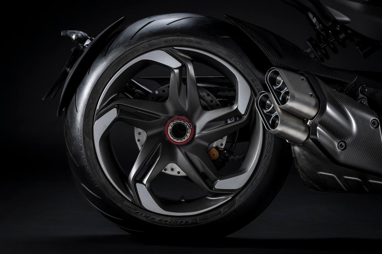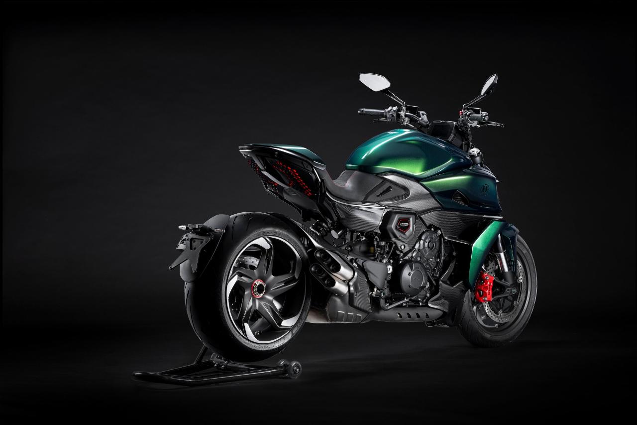 So übernimmt die Diavel vom Batur etwa die ausgeprägten horizontalen Linien in der Seitenansicht. Die elegante Scarab Green-Lackierung mit ihren vielen Metallic-Schattierungen stammt aus der Bentley Mulliner-Palette und findet sich auf den Verkleidungsteilen wieder. Die geschmiedeten Felgen, die speziell für dieses Motorrad entworfen und hergestellt wurden, erinnern an die Felgen des Autos und sind in Dark Titanium Satin lackiert, wobei einige bearbeitete Flächen unlackiert bleiben.