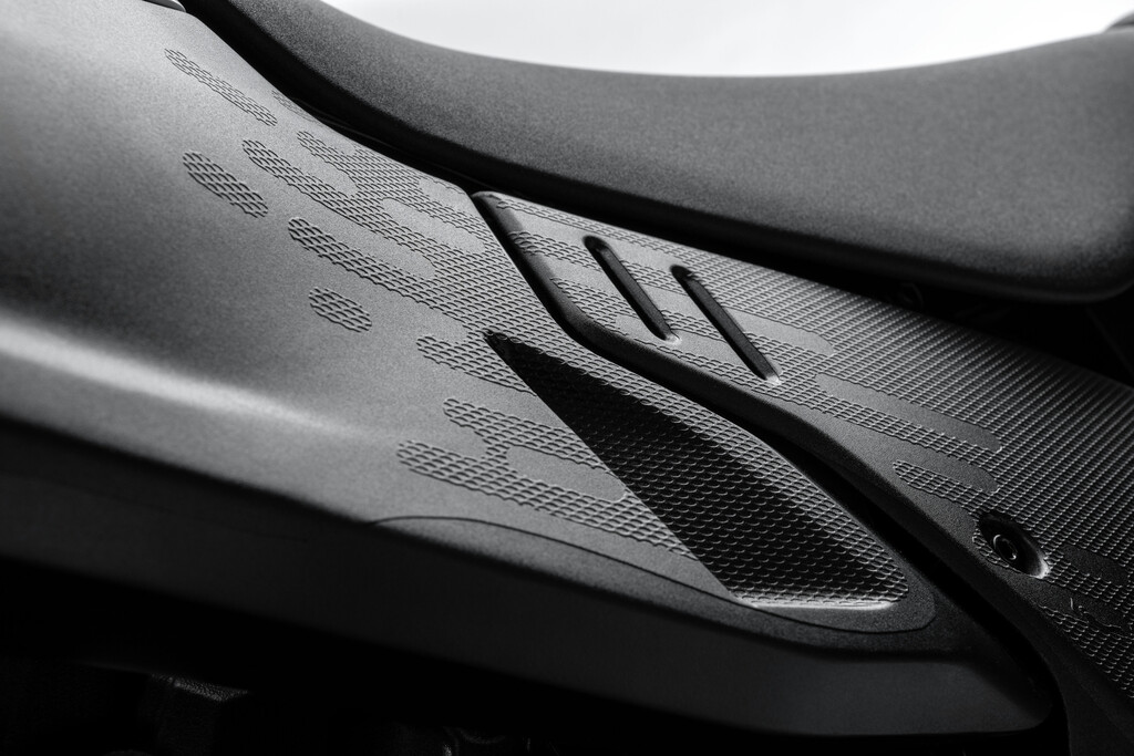 Das neue Ergonomiedreieck entstand durch nach hinten versetzte Fußrasten sowie nach vorn verlegte Sitzbank und Lenker. Das Ergebnis ist eine aktivere Fahrerhaltung, die sportliches Fahren und Kontrolle im Gelände verbessert. Der neue 18-Liter-Kraftstofftank aus Polymer ist schlanker und leichter und unterstützt Bewegungen im Sattel und hat Crashpads. Er ist außerdem sehr tief platziert und senkt so den Schwerpunkt des Motorrads. Die Seitenteile sind auf Körperbewegungen abgestimmt und besitzen eine griffige Oberfläche, die Halt und Fahrgefühl verbessert und das Fahren im Stehen erleichtert. Im Zubehörprogramm gibt es unter anderem einen acht Liter fassenden hinteren Zusatztank.