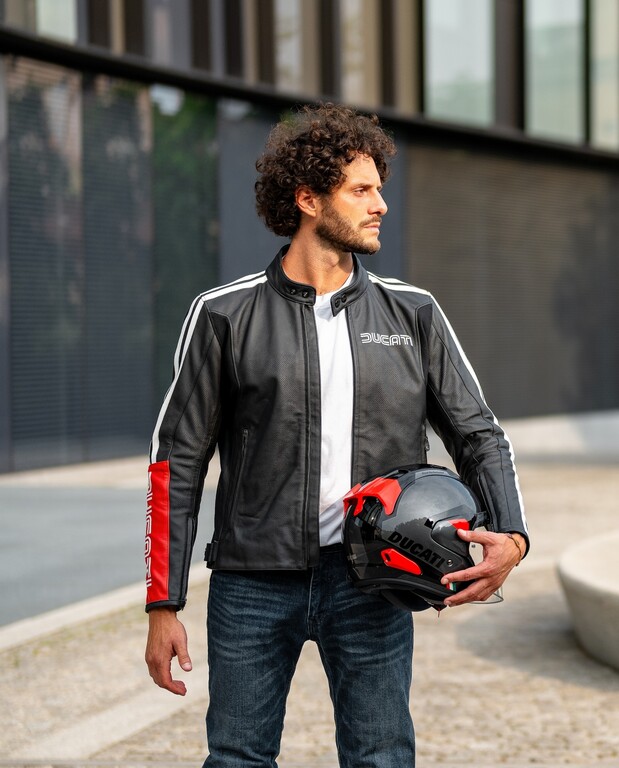 Die Icon-Linie ist auf Lifestyle ausgerichtet. Zu den Kleidungsstücken für Damen und Herren gehört auch eine Lederjacke. Eine Kappe, ein Poloshirt, ein Kapuzen-Sweatshirt und ein T-Shirt – jeweils in Rot und Schwarz – bilden die limitierte Tomorrow-Linie, die das Ducati-Logo neu interpretiert. (aum)