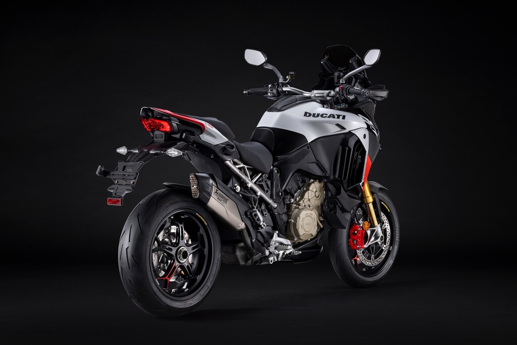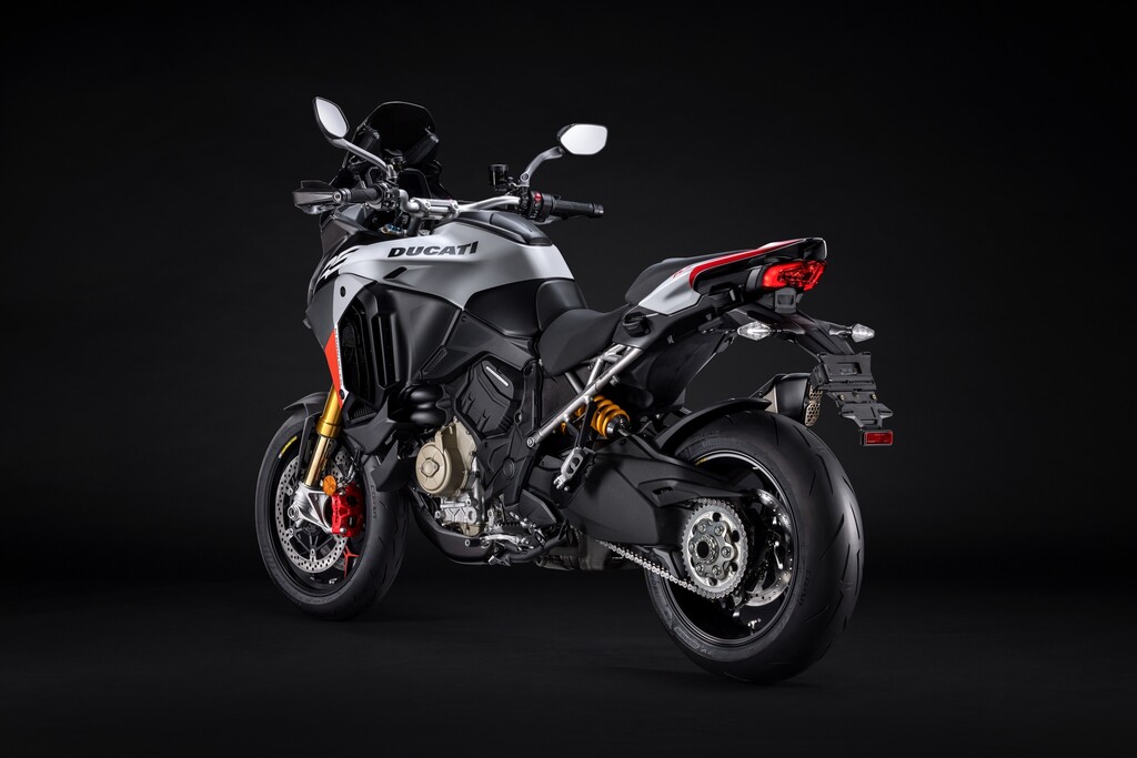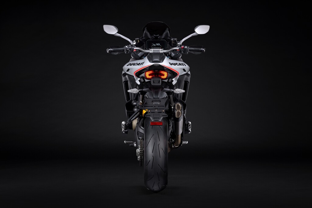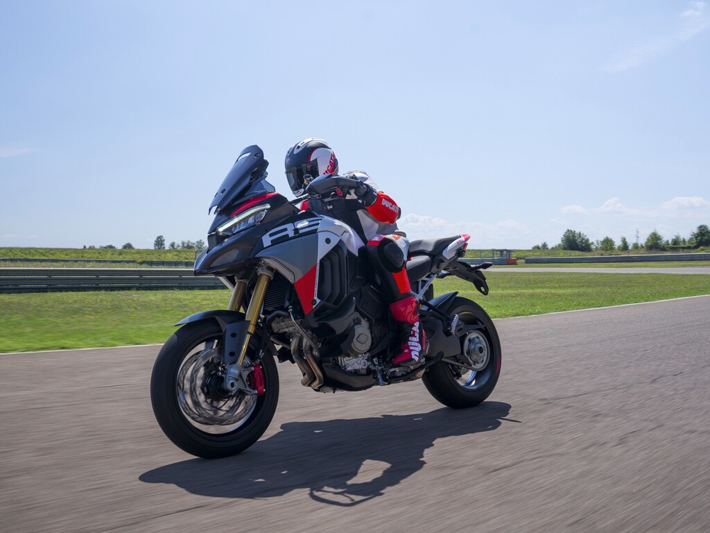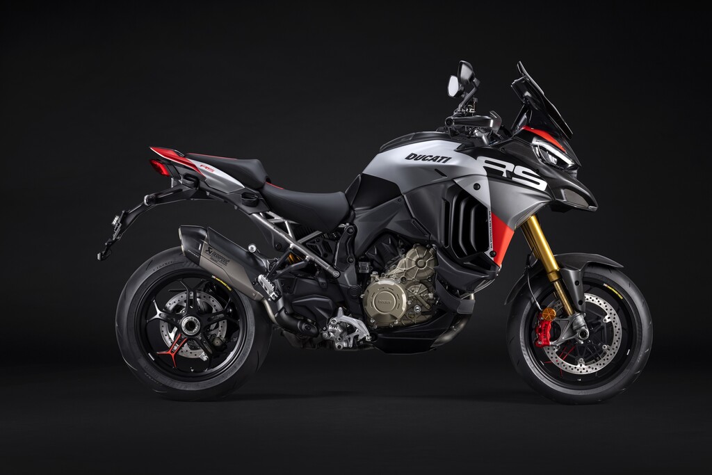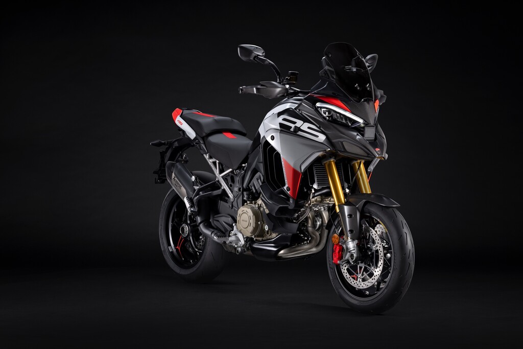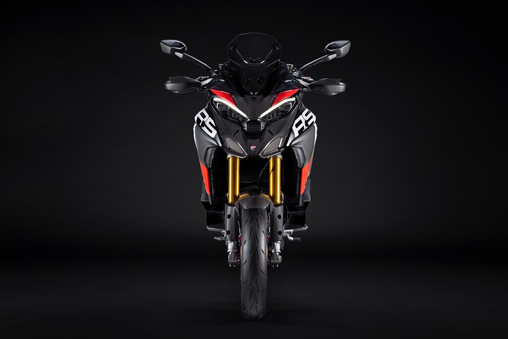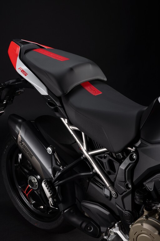 Die Multistrada V4 RS verfügt serienmäßig über das aus dem Moto GP entlehnte Elektronikpaket Ducati Vehicle Observer (DVO) mit einem Algorithmus, der 70 Sensoren simuliert. Das Öhlins-Fahrwerk verfügt über eine geänderte Regelstrategie und das Hinterrad bekommt eine 280 Millimeter große Bremsscheibe. Der Titan-Heckrahmen kann nun auch ein Topcase aufnehmen. Frontkotflügel, Handprotektoren, Hitzeschilde und Front-Schnabel bestehen aus Carbon. Die Schmiederäder, eine leichte Lithiumionen-Batterie und eine speziell für dieses Modell entwickelte Verkleidung aus Technopolymer senken das Gewicht gegenüber der Multistrada Pikes Peak um zwei Kilogramm. Die fortlaufende Seriennummer ist auf einer schwarz eloxierten Aluminiumplatte an der Gabelbrücke angebracht und mit der italienischen Flagge verziert. Das Display begrüßt den Fahrer mit einer speziellen Animation.