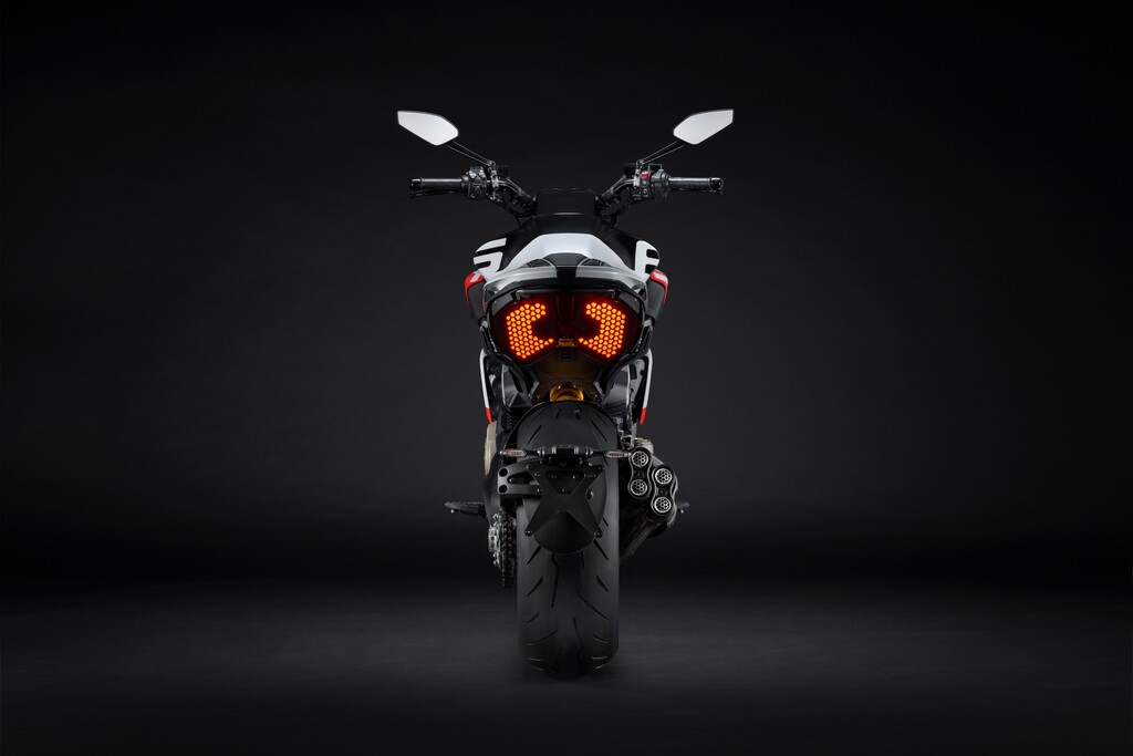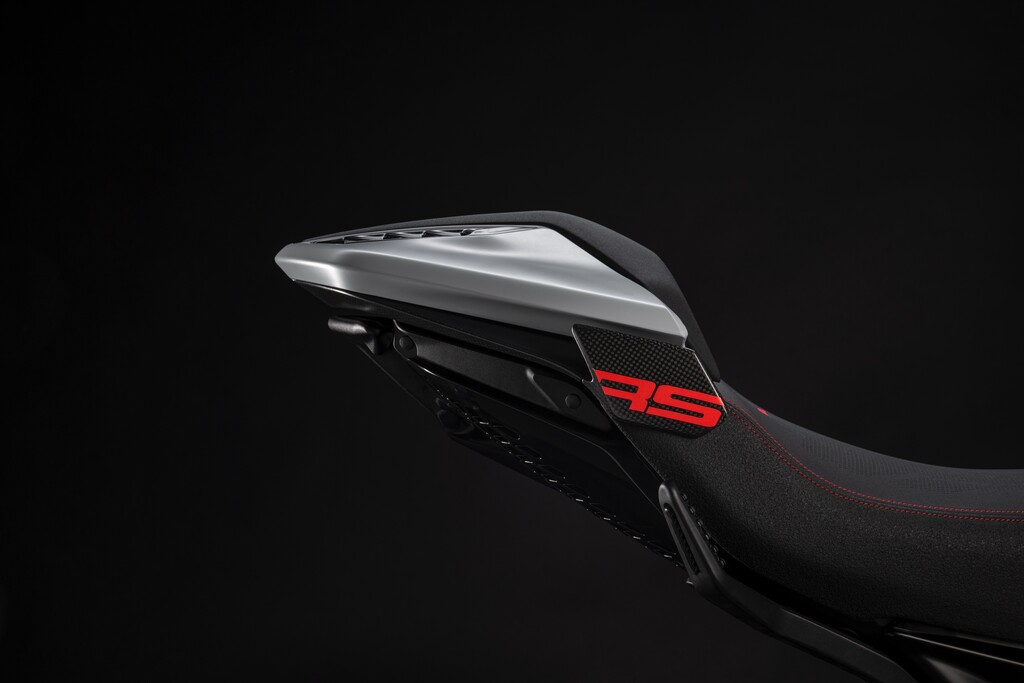 Carbon-Elemente – von den Lufteinlässen über das Einsitzer-Heck bis hin zu Kotflügeln und Tankabdeckungen – reduzieren das Gewicht des Motorrads um drei Kilogramm 3 kg. Eigen entwickelte Schmiederäder, der Akrapivic-Endschalldämpfer und das semi-aktive Öhlins-Fahrwerk. Das „RS“-Logo findet sich auf der Lackierung, am Keyless-Zündschlüssel, in der speziellen Displaygrafik und auf der Zylinderkopfabdeckung der hinteren Zylinderbank, wo sich auch die Seriennummer des Motorrads befindet.