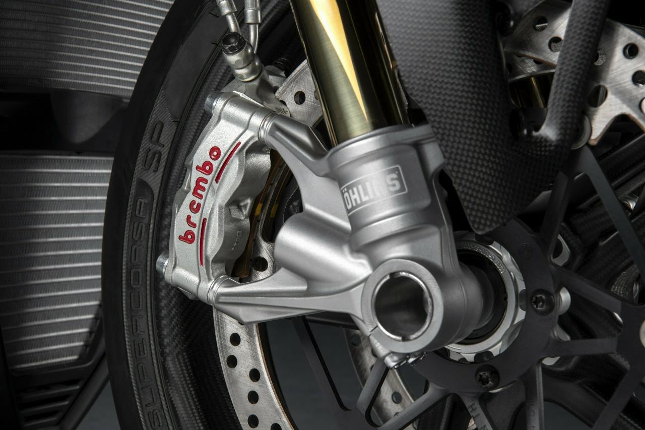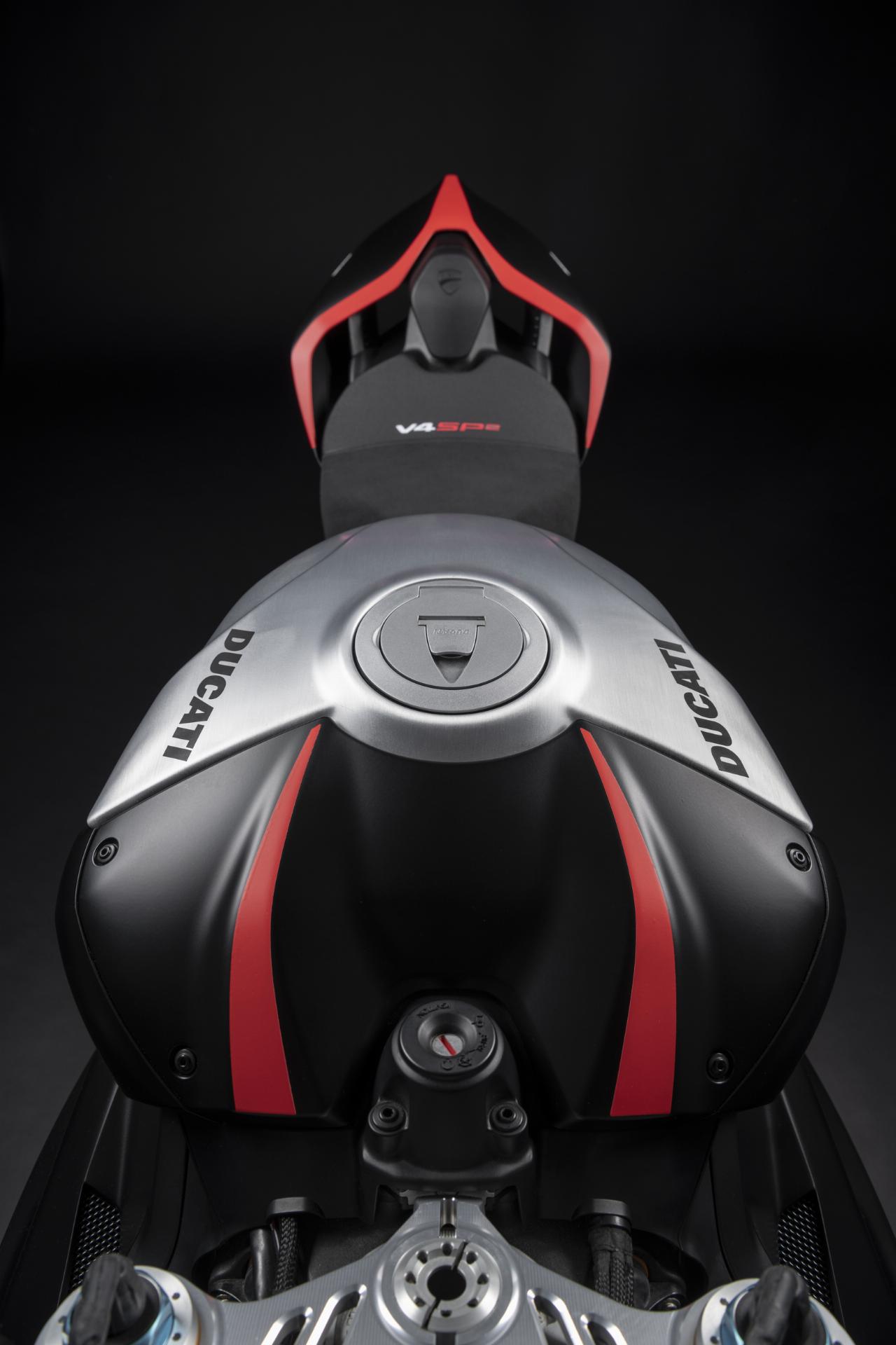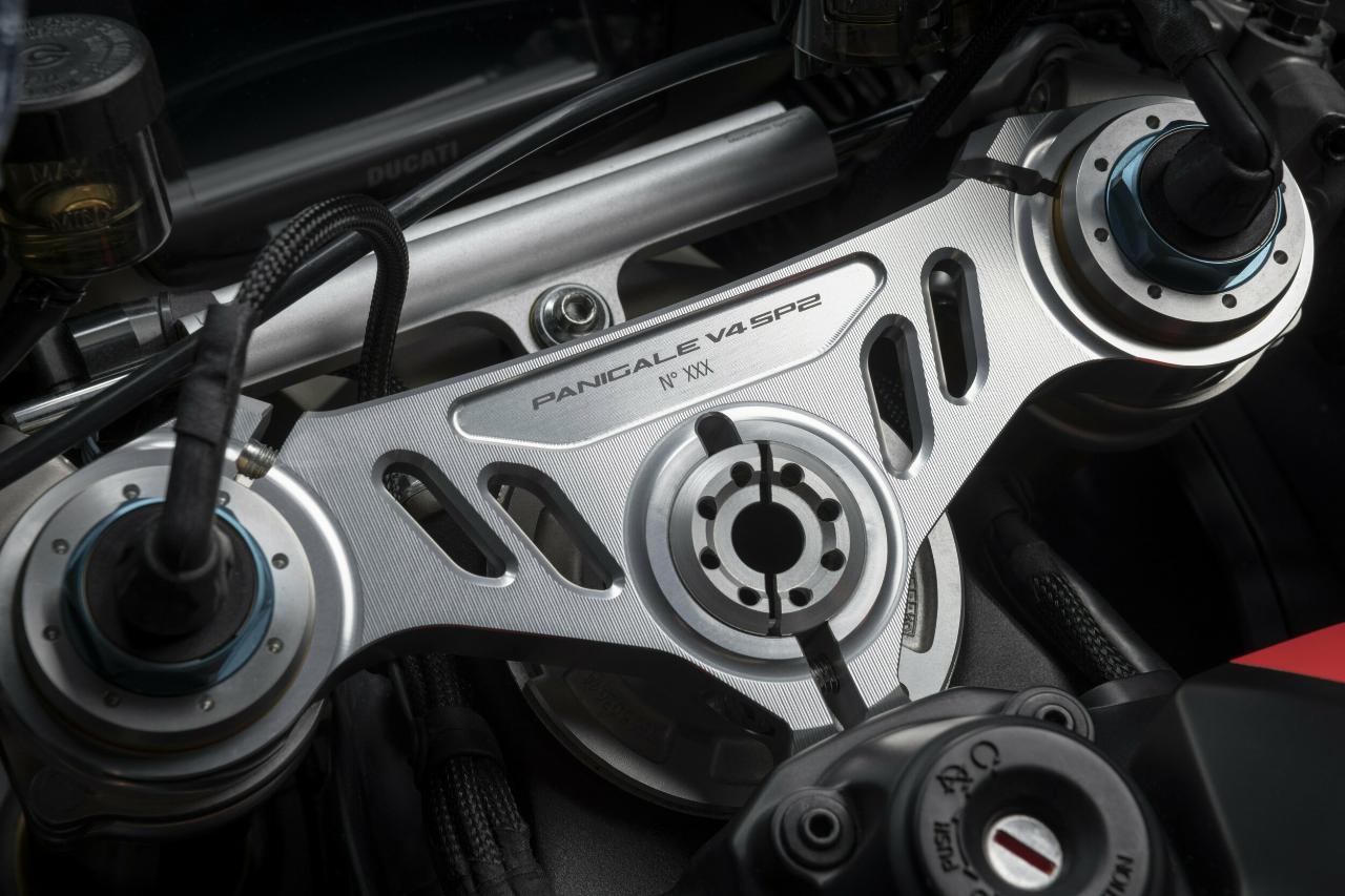 Die Panigale V4 SP2 richtet sich an nicht-professionelle Fahrer und trägt die spezielle „Winter Test"-Lackierung der Werksmaschinen. Die italienische Flagge schmückt die Doppelprofil-Winglets, wie sie auch auf der offiziellen Panigale V4 R SBK zu sehen ist. Der untere Teil der Verkleidung trägt im Bereich der neuen Luftauslässe das Ducati-Corse-Logo. Auf der Gabelbrücke findet sich die Seriennummer jedes Motorrads.