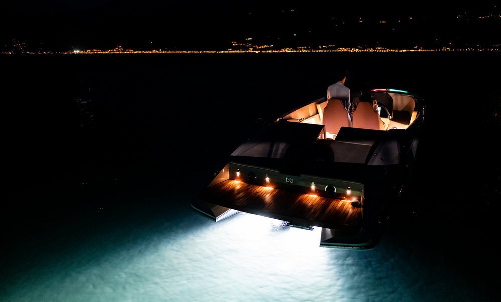 Zusätzlich ist die e-Fantom mit zwei klappbaren Biminis ausgestattet, die an sonnigen Tagen Schatten spenden. Ein Kühlfach und eine LED-Unterwasserbeleuchtung gibt es ebenfalls. Serienmäßig ist außerdem ein High-End-Audiosystem mit Bluetooth- und WLAN-Konnektivität an Bord. Bedienen lässt es sich über das zwölf Zoll große Multiinformationsdisplay. Integriert in das Anzeigekonzept sind Echolot und Kartenplotter. Ein Bugstrahlruder vereinfacht das Ein- und Ausparken. Polsterung, Rumpf und Deck sind in verschiedenen Farben bestellbar. Zur Wahl steht die gesamte, von Porsche für seine Straßenfahrzeuge angebotene Farbpalette.