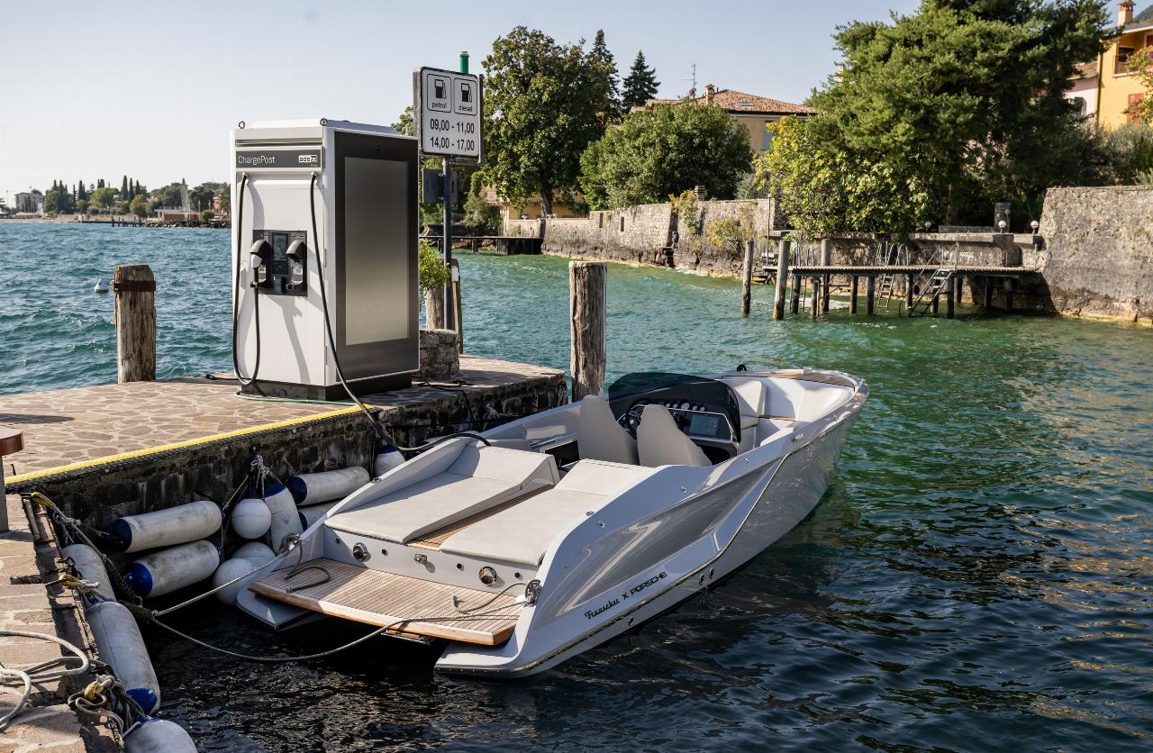 Dank der 800-Volt-Technik von Porsche kann das Elektroboot an Schnellladestationen mit über 250 kW Gleichstrom geladen werden. So lässt sich die Batterie in deutlich unter 30 Minuten von zehn bis 80 Prozent SoC (State of Charge) aufladen. AC-Laden mit Wechselstrom an herkömmlichen Haushalts- und Starkstrom-Anschlüssen, wie sie am häufigsten in Häfen vorhanden sind, ist ebenfalls möglich. Dafür ist an Bord.