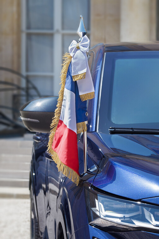 Zu den besonderen Merkmalen gehören neben der gepanzerten und in exklusivem Bleu Présidence lackierten Karosserie ein Kühlergrill in den Nationalfarben, abnehmbare Fahnenhalter und blaue, weiße und rote Embleme an den Vordertüren. Der Lack besitzt zudem einen blau-weiß-roten Glitzereffekt, der im Sonnenlicht sichtbar wird. Das Soft-Close-System der hinteren Türen sorgt für leises Öffnen und Schließen und entspricht den protokollarischen Anforderungen.