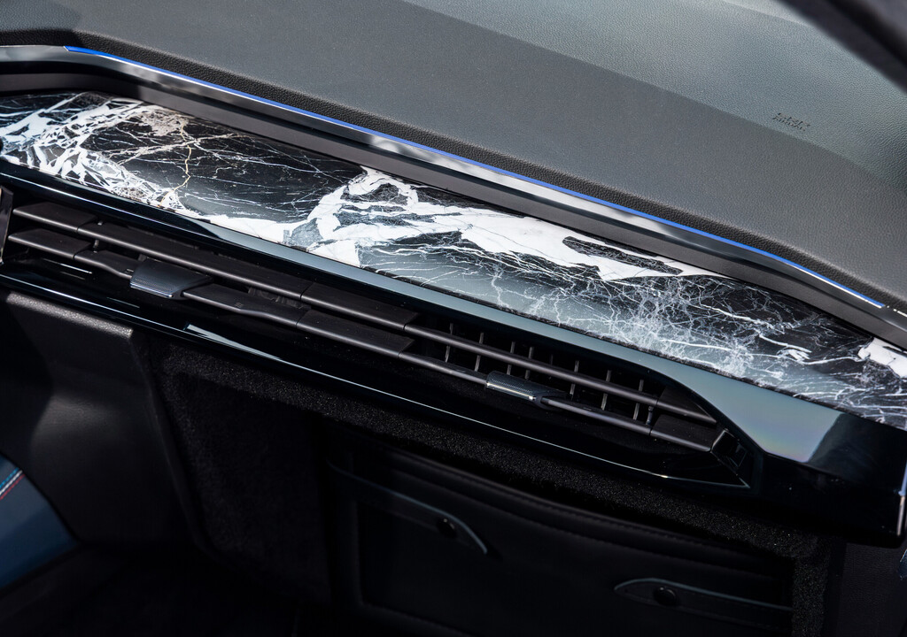 Im Innenraum findet sich an einigen Stellen schwarzer Marmor mit weißen Adern, der in den Pyrenäen abgebaut wird, und dunkles Buchenholz mit Intarsienverzierung. Das Leder stammt aus ausgewählten Reststücken und wurde in speziellen Farben neu verarbeitet, während die blauen Ziernähte der offiziellen Farbpalette der Republik entsprechen. Die Kopfstützen sind mit einer fein gearbeiteten Lasergravur des französischen Wappens versehen: eine Pelta mit Liktorenbündel und Eichen- und Olivenzweigen. (aum)