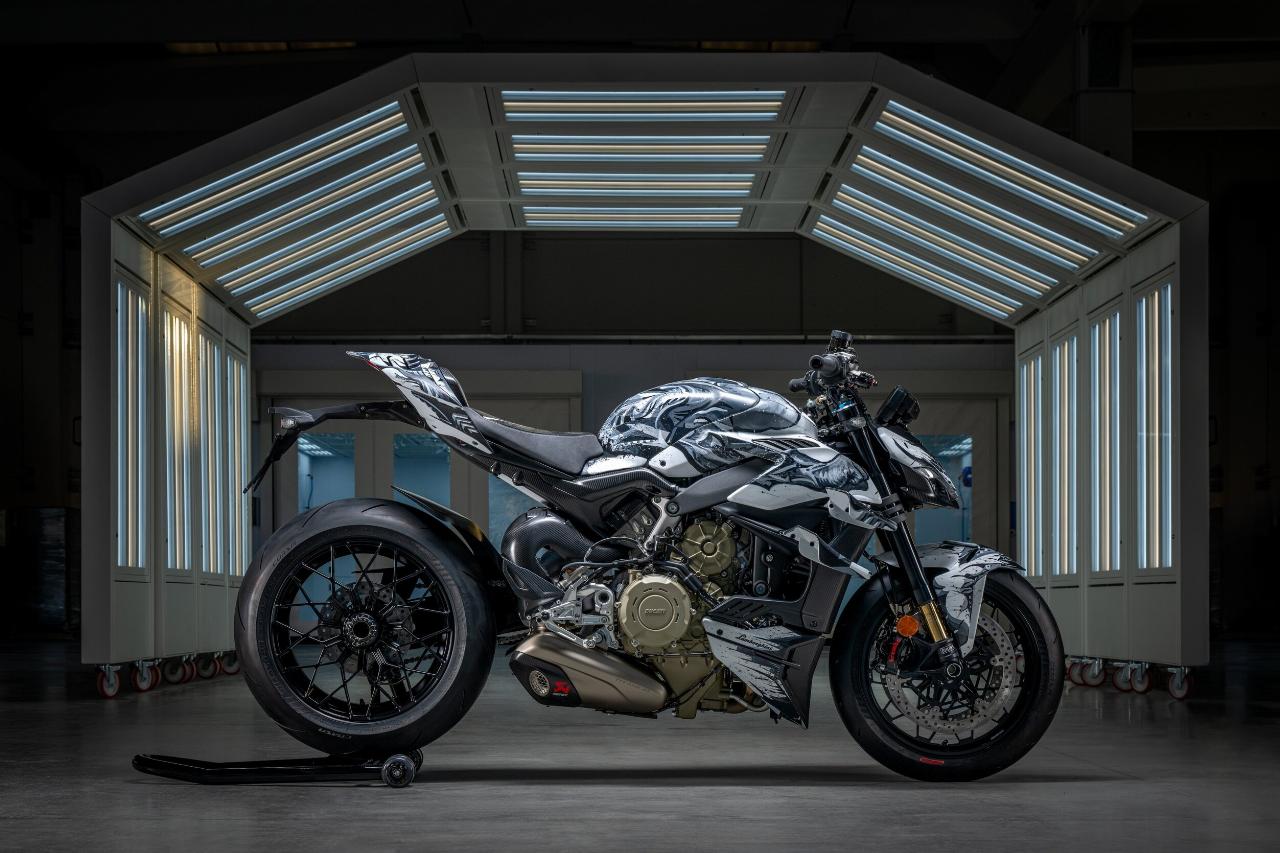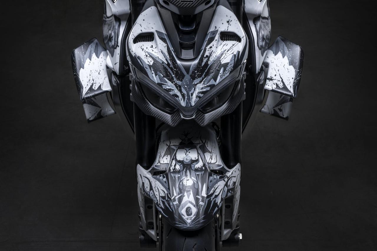 Paolo Troilo ist für seine hyperrealistische Fingermalerei bekannt, mit der er 2021 auf der Karosserie eines Lamborghini Huracán Evo das Gemälde „Minotauro“ schuf. Das Nachfolgewerk „Centauro“ zeigt auf der Ducati die figurative Darstellung von den Armen eines Mannes während der Beschleunigung. Die Malerei umschließt die beiden Seiten des Tanks. Vervollständigt wird das Kunstwerk mit abstrakten geometrischen Formen auf den übrigen Teilen des Motorrads.