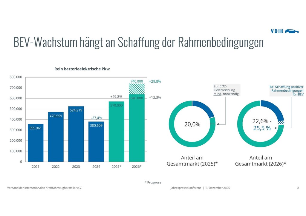 Einen Hauch von 0,4 Prozent Wachstum beim Pkw-Absatz des kommenden Jahres sieht der Verband der internationalen Kraftfahrzeughersteller (VDIK) für das kommende Jahr. Bei seiner Jahres-Pressekonferenz nannte Imelda Labbé als Bedingung für diese positive Entwicklung auf 2,9 Millionen in Deutschland neu zugelassene Fahrzeuge, dass die von der Bundesregierung angekündigten Förderprogramme für die Elektromobilität umgesetzt werden. Andernfalls werde der Wert nur bei 2,8 Millionen Neuzulassungen liegen.