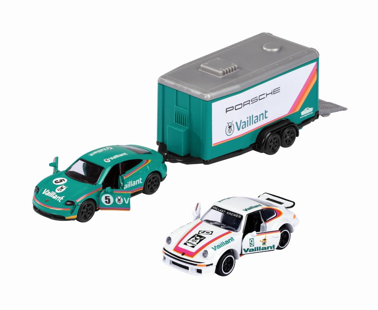 Mit dem Modellauto zur Rennstrecke: Majorette hat vier „Race Trailer“-Sets fürs Kinderzimmer ins Programm aufgenommen. Die 19 Zentimeter langen Gespanne im „Matchbox“-Maßstab bestehen jeweils aus einem Zugfahrzeug und einem aufklappbaren Transportanhänger samt Motorsportwagen. Das Porsche-Gespann im Sponsordesign von Vaillant bilden ein Taycan Turbo S und ein 934 im Renndress, beim Team Ford nimmt ein F-150 Raptor einen Mustang GT mit und ein Land Rover Defender 110 schleppt einen Jaguar F-Type im Billstein-Branding. Vierter im Bunde ist ein Mack Granite mit einem Nissan GT-R Nismo GT3 im Schlepp.
