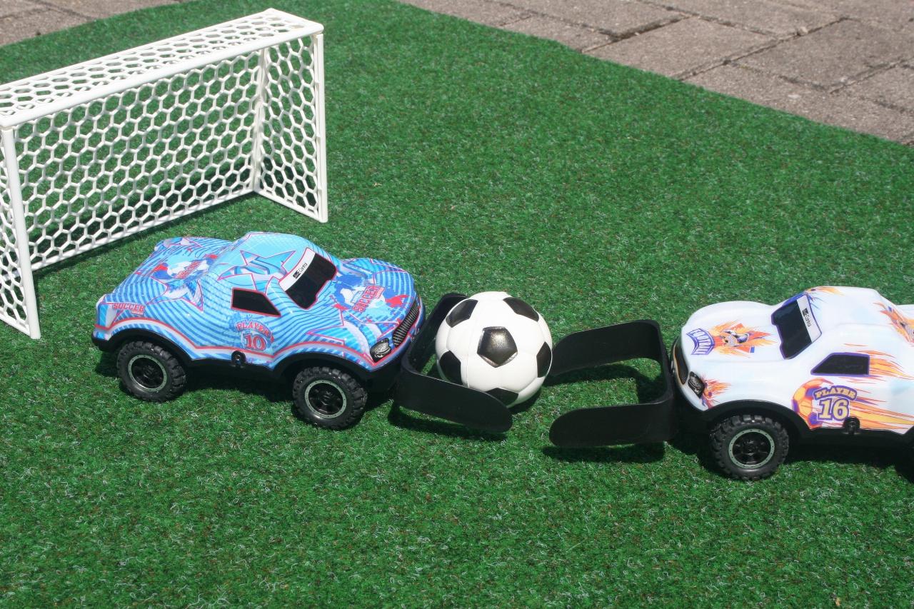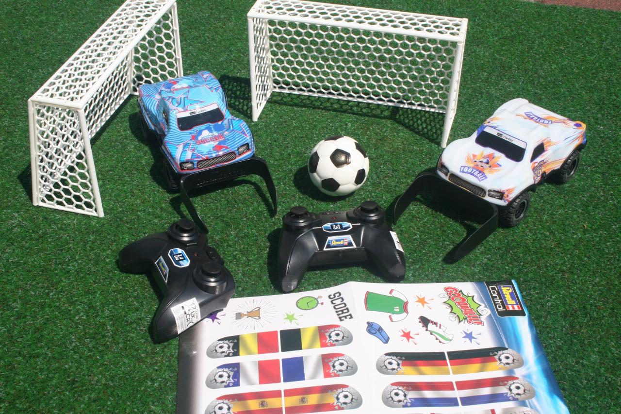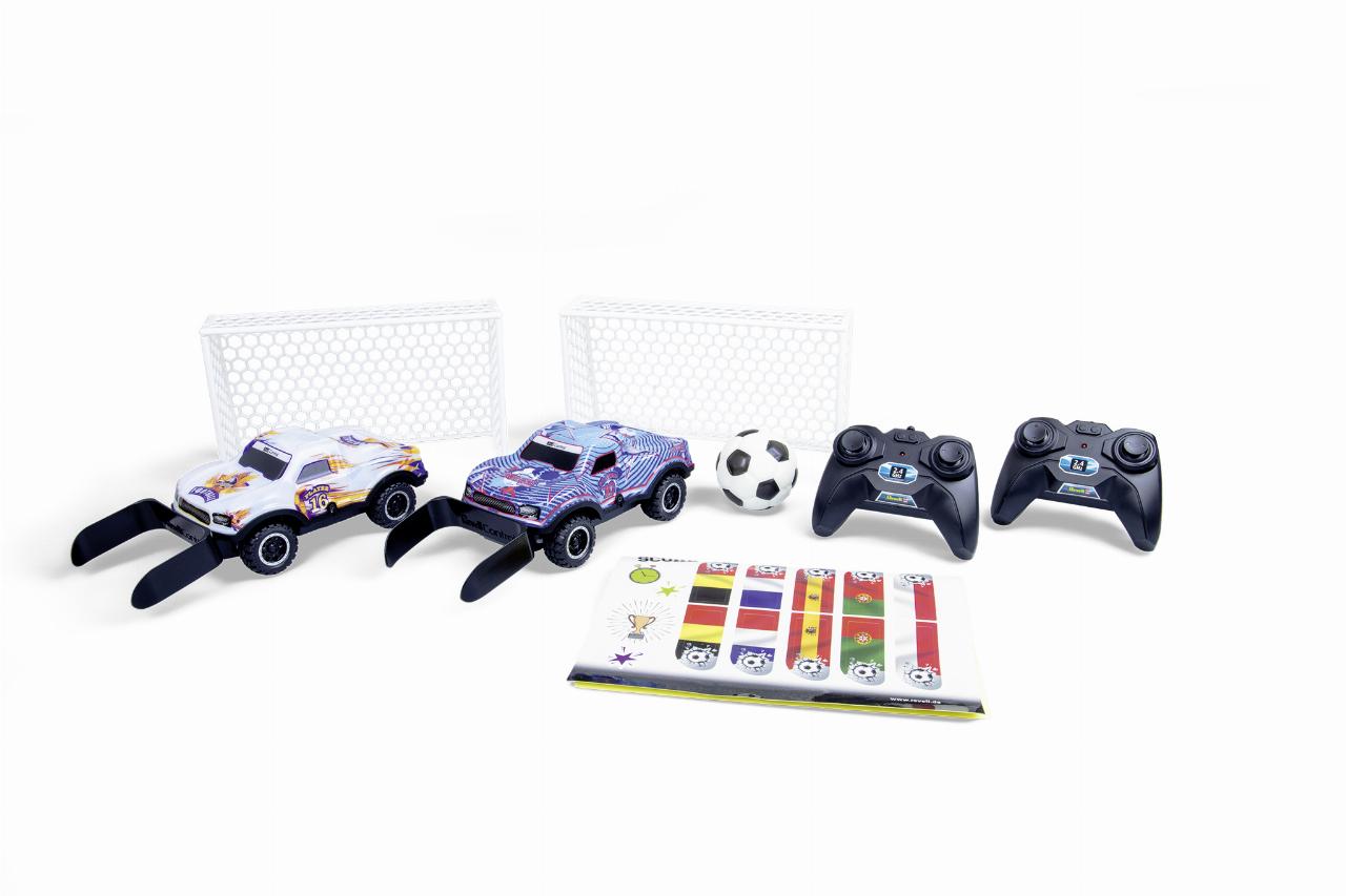 Den Maßstab der ferngesteuerten Kicker auf vier Rädern gibt Revell mit 1:22 an. Die Lexan-Karosserie leuchtet und erlaubt so auch Begegnungen unter „Flutlicht“. Der softe Fußball hat einen Durchmesser von sechs Zentimetern. Die dem Set beigelegten beiden Plastiktore sind 22 Zentimeter breit, zwölf Zentimeter hoch und sieben Zentimeter tief. Zudem gibt es noch einen Stickerbogen mit neun Nationalitäten-Aufklebern und einige weiteren Fußballmotiven zur Individualisierung der beiden in Weiß und in Bau gehaltenen Autos. Bewegt werden sie jeweils über eine Fernsteuerung mit zwei Joysticks für vor- und rückwärts sowie links und rechts. Benötigt werden zusätzlich insgesamt zehn AA-Batterien.