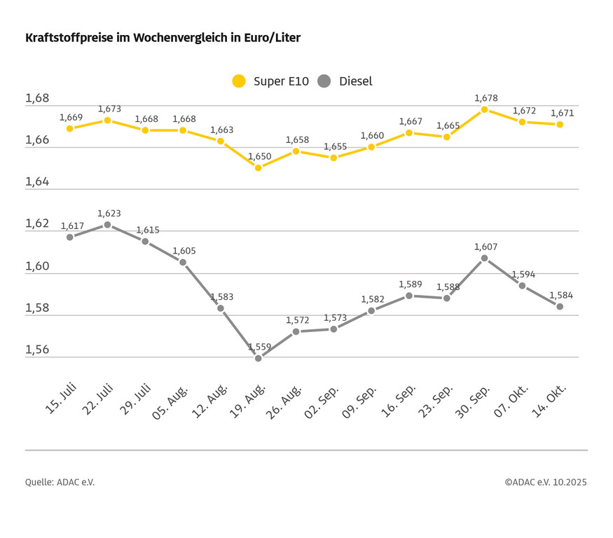 Der Preisunterschied zwischen Diesel und Super E10 hat sich mit nun 8,7 Cent je Liter (Vorwoche: 7,8 Cent) erneut etwas vergrößert. Trotz dieser Entwicklung bleibt die Differenz jedoch deutlich unter dem steuerlichen Abstand von rund 20 Cent je Liter – ein Hinweis darauf, dass das allgemeine Preisniveau des Selbstzünderkraftstoffs weiterhin hoch ist.