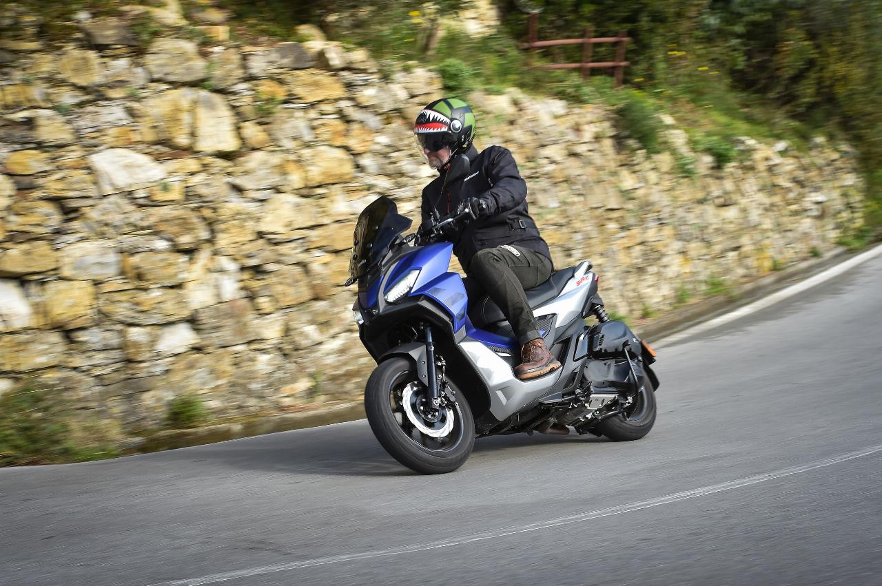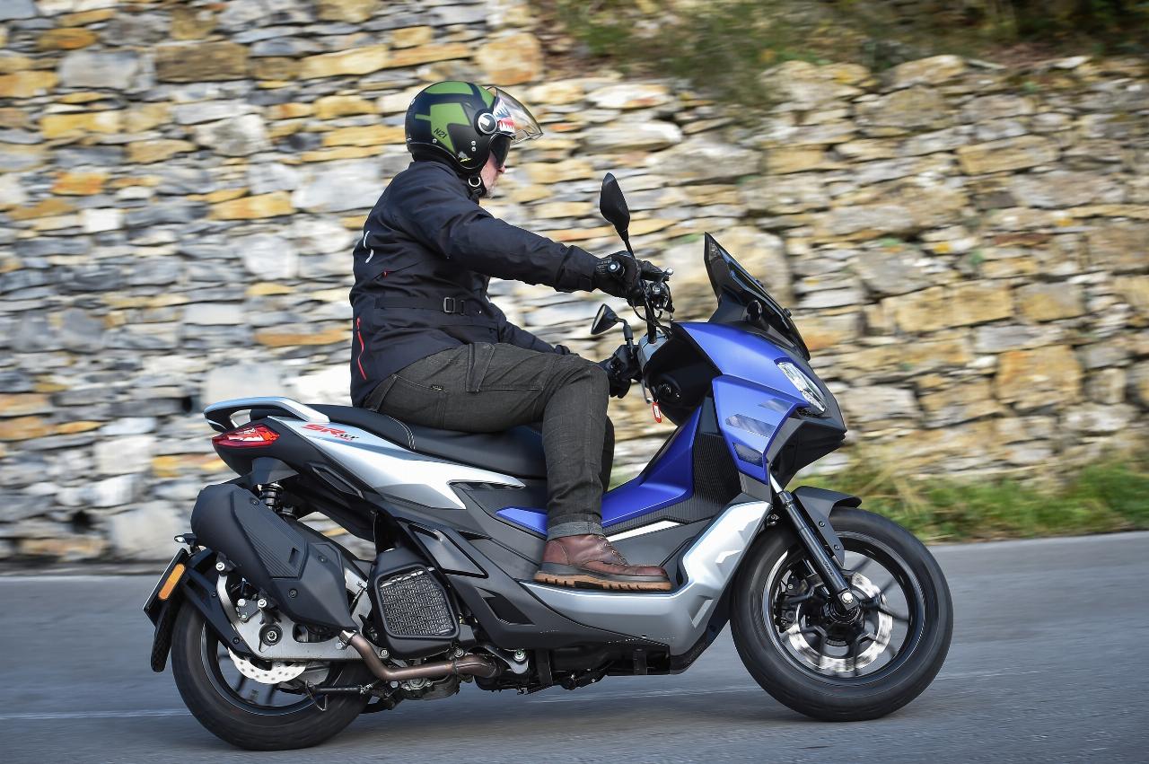 Leichtfüßige 144 Kilogramm wiegt der SR GT 125, unwesentliche vier Kilo mehr der SR GT 200. Die stufenlose Automatik setzt beide zügig in Bewegung. 12 Nm bei 6500 Umdrehungen pro Minute schickt der 125er an die Triebsatzschwinge, 16,5 Nm bei 7000 U/min sind es beim 200er. Die maximale Leistung beträgt hier 18 PS (13 kW) bei 8500 U/min und erfordert Führerscheinklasse A2. Der 125er leistet A1- und B196-konforme 15 PS (elf kW) bei 8750 Touren.