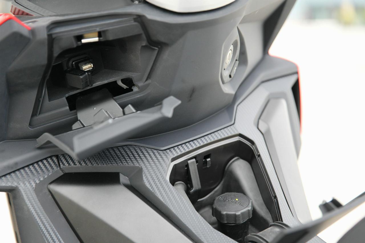 Die Höchstgeschwindigkeit gibt Aprilia mit 99 km/h an beim SR GT 125 und 114 km/h beim SR GT 200. Das reicht vollkommen, ebenso wie der Stauraum. Das geräumige 25-Liter-Staufach unterm Sitz fasst locker einen Visor-Helm plus Kleinkram. Eine Feder hält die breite Sitzbank nach dem Öffnen im 90-Grad-Winkel oben. Zum Fernentriegeln gibt es einen Knopf neben dem Zündschloss. Links in der Frontverkleidung befindet sich ein praktisches Handyfach mit Lademöglichkeit. Das LCD-Display ist tadellos ablesbar, wenn auch etwas schmucklos. Via Bluetooth und Aprilia-MIA-App lässt sich das Smartphone koppeln.