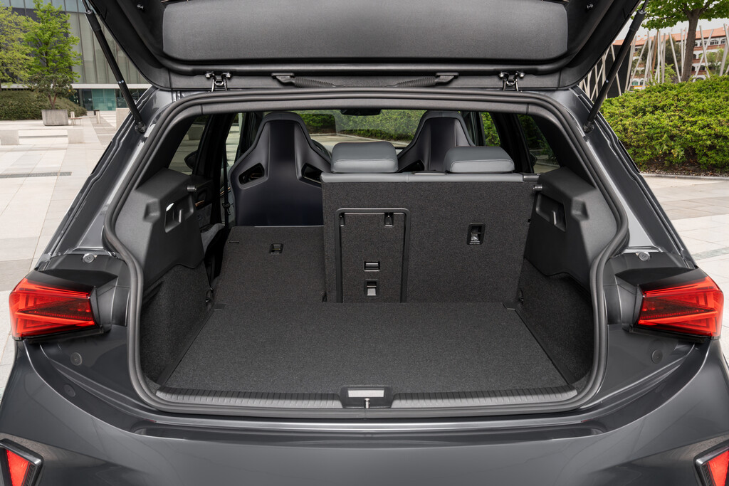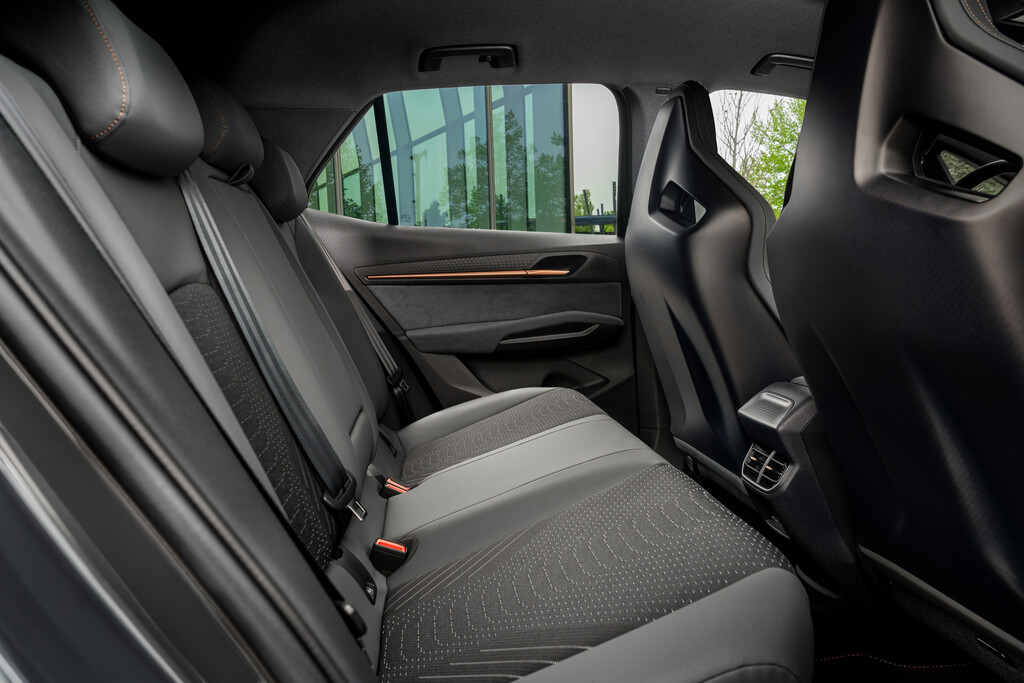 Auch im Fahrgastraum beschert die E-Architektur ungewohnten Platz. Sogar in zweiter Reihe. Für ähnlich viel Freiraum in einem Verbrenner müsste man eine Klasse höher einsteigen. Der Vorteil, wenn die Batterie flach im Boden liegt und der permanent erregte Synchronmotor unterm Kofferraum. Und so steckt der 4,34 Meter lange Born Einiges weg: 385 Liter hinterm Gestühl – bei flachen Lehnen fast 1,3 Kubikmeter. Lediglich der Einstieg im Fond erfordert eine leicht demütige Kopfhaltung. Ein kleines Opfer angesichts der schnittigen Dachlinie und der gegenüber dem VW ID.3 um anderthalb Zentimeter geduckteren Haltung.