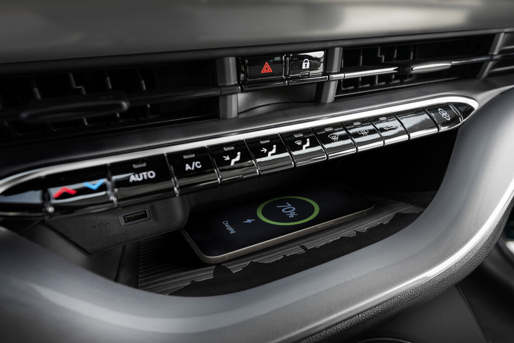 Die Materialien sind angesichts des Kostendrucks in diesem Segment einfach, aber sauber verarbeitet, so dass eine durchaus angenehme Atmosphäre entsteht. Die Informationszentrale vor dem Lenkrad lässt sich gut ablesen. Über den zentralen, 10,25 Zoll messende, Bildschirm lassen sich die wichtigsten Einstellungen bedienen. Darunter ist eine Leiste mit analogen Schaltern angeordnet. Allerdings lässt sich der Bildschirm bei intensiver Sonneneinstrahlung nur schwer ablesen. Darüber befindet sich die Fläche für die Aufladung des Smartphones, die mit der Silhouette der Stadt Turin eingefasst ist. Der 500 Hybrid, ist, so Morosino „smartphone-freundlich“, was nichts anders bedeutet, dass die Navigation über das Handy erfolgt.