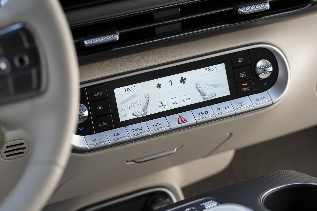 Im Innenraum empfängt den Menschen hinter dem Lenkrad eine aufgeräumte Instrumentensammlung und, Designer mögen es blumig, „die Schönheit des weißen Raums“, mit der die traditionelle koreanische Architektur aufgegriffen wird. Nach dem Start verwandelt sich die beleuchtete Kristallkugel auf der Mittelkonsole in die Getriebesteuerung und signalisiert so, dass die Systeme auf „Go“ geschaltet sind. Zwei Monitore (jeweils 12,3 Zoll) sind für Infotainment und Fahrinformationen zuständig. Gleichzeitig sind die Schalter auf ein Minimum reduziert. Dank des großzügigen Radstands (2,90 Meter) herrschen an Bord angenehme Platzverhältnisse, und die gewählten edlen und bestens verarbeiteten Materialien tragen zur komfortablen Atmosphäre bei.