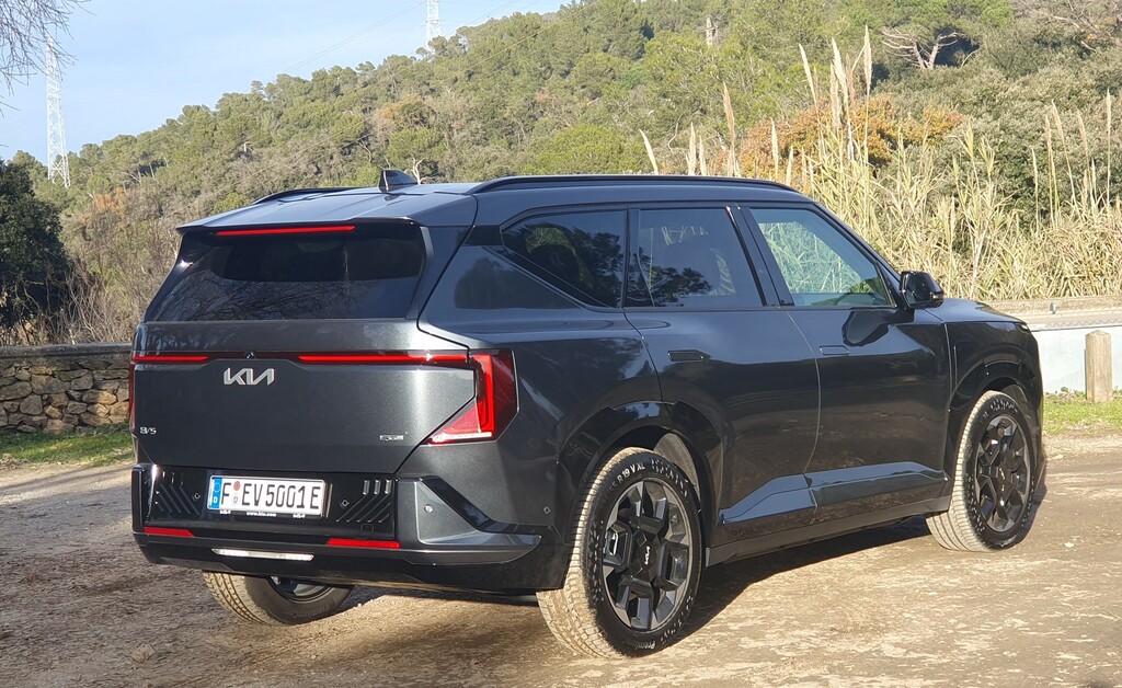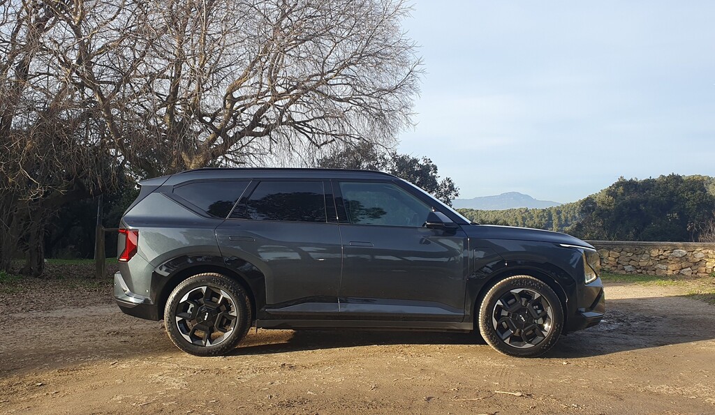 Schon der erste Kontakt hinterlässt einen guten Eindruck. Mit seiner kantigen Erscheinung, der wuchtigen Fronthaube und der markentypischen Lichtsignatur schiebt er sich nahtlos in Kias Elektro-SUV-Familie zwischen EV3 und EV9. Die 4,61 Meter lange, 1,88 Meter breite und 1,68 Meter hohe Karosse wirkt mit ihrer klaren Linienführung und flächigen Gestaltung stattlich und selbstbewusst, fühlt sich im Stadtverkehr aber weniger sperrig an, als die Zahlen vermuten lassen. Die hohe Sitzposition verschafft Überblick, die Karosserie lässt sich gut einschätzen, und die klare Formensprache hilft beim Rangieren. In der von uns gefahrenen Topversion GT-Line sorgen dazu dunkle Akzente, spezifische Felgen und Details in Hochglanzschwarz für einen dezenten sportlichen Anstrich.