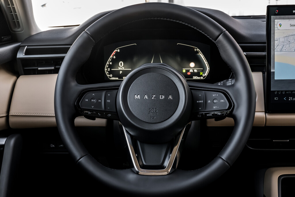 Auch die Bedienung trägt maßgeblich zu diesem Eindruck bei. Im Cockpit vollzieht Mazda einen deutlichen Schritt in Richtung Digitalisierung. Statt des bisherigen Dreh-Drück-Stellers dominiert nun ein großes Touchdisplay, wahlweise mit 12,9 oder 15,6 Zoll Diagonale. Die Oberfläche ist widgetbasiert aufgebaut, erinnert an Smartphones und lässt sich individuell konfigurieren. Google-Dienste wie Maps oder der Play Store sind serienmäßig integriert, künftig soll sogar der KI-Sprachassistent Gemini Einzug halten.