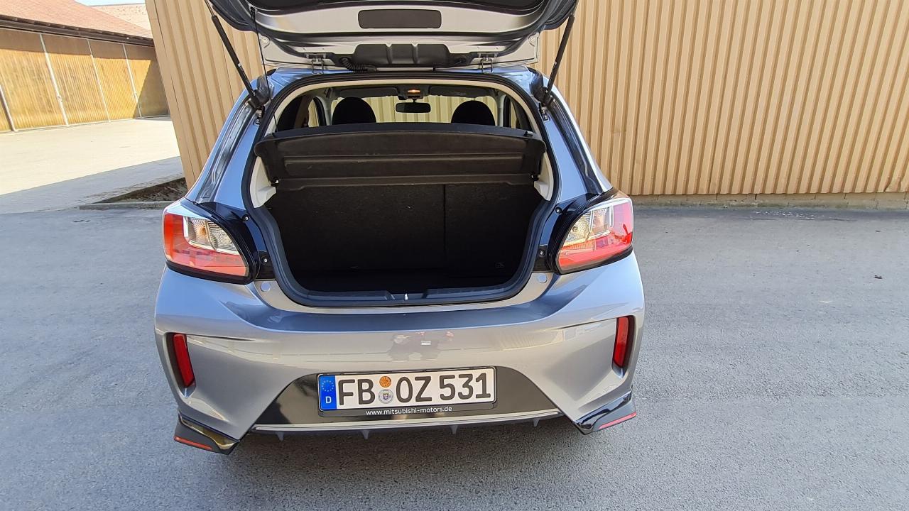 Dabei basieren die als überraschend spritzig empfundenen Fahrleistungen nicht allein auf der Durchzugsstärke des Dreizylinders, auch das geringe Gewicht des Space Star steigert seine Agilität. 940 Kilogramm wiegt er, damit ist er 100 Kilogramm leichter als der Vorgänger Colt, allerdings auch rund 20 Zentimeter kürzer. Die zuverlässig arbeitende Start-Stopp-Automatik unterstützt bei der Mäßigung des Treibstoffkonsums, letztlich waren es 4,7 Liter Benzin, mit denen der Space Star auf unseren Fahrten 100 Kilometer weit kam.