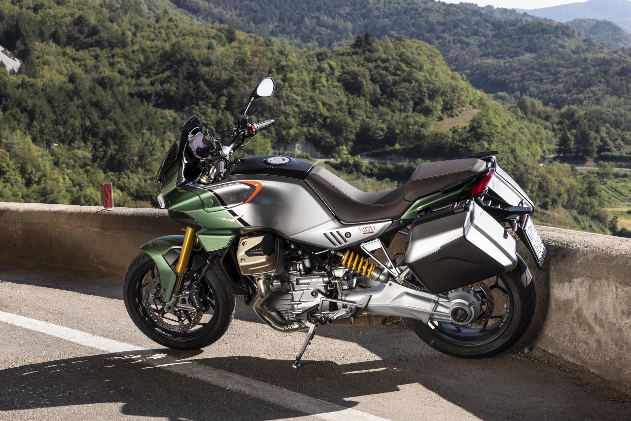 Vier Fahrmodi sind Serie. Motorbremsmoment, Motorkennfelder und Traktionskontrollstufen sind jeweils einstellbar, ebenso die Deflektoren. Im Rain-Modus sind sie werksseitig permanent geöffnet, im Tour-Modus je nach gewählter Geschwindigkeit. In den Fahrprogrammen Sport und Road bleiben sie geschlossen, solange der Fahrer sie nicht im Menü aktiviert. Das Superhirn der neuen Guzzi umfasst unter anderem die elektronische Drosselklappensteuerung Ride-by-Wire für die präzise Abstimmung von Leistung und Verbrauch und die Sechs-Achsen-Inertiaplattform (IMU). Letztere ist durch ihre Beschleunigungsmesser und Gyroskope in der Lage, die Position der Maschine im Verhältnis zur Fahrbahn zu erkennen. Auf diese Weise kann sie das Sicherheits-Potenzial der schräglagenabhängigen Assistenzsysteme wie Traktionskontrolle und Kurven-ABS voll ausschöpfen.