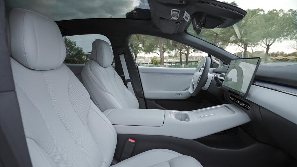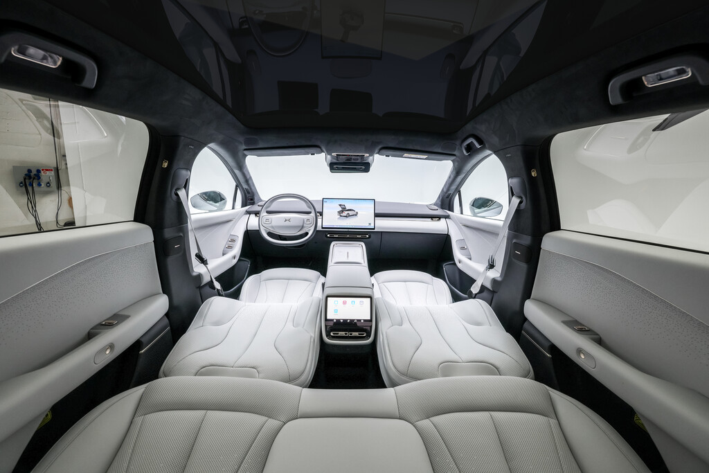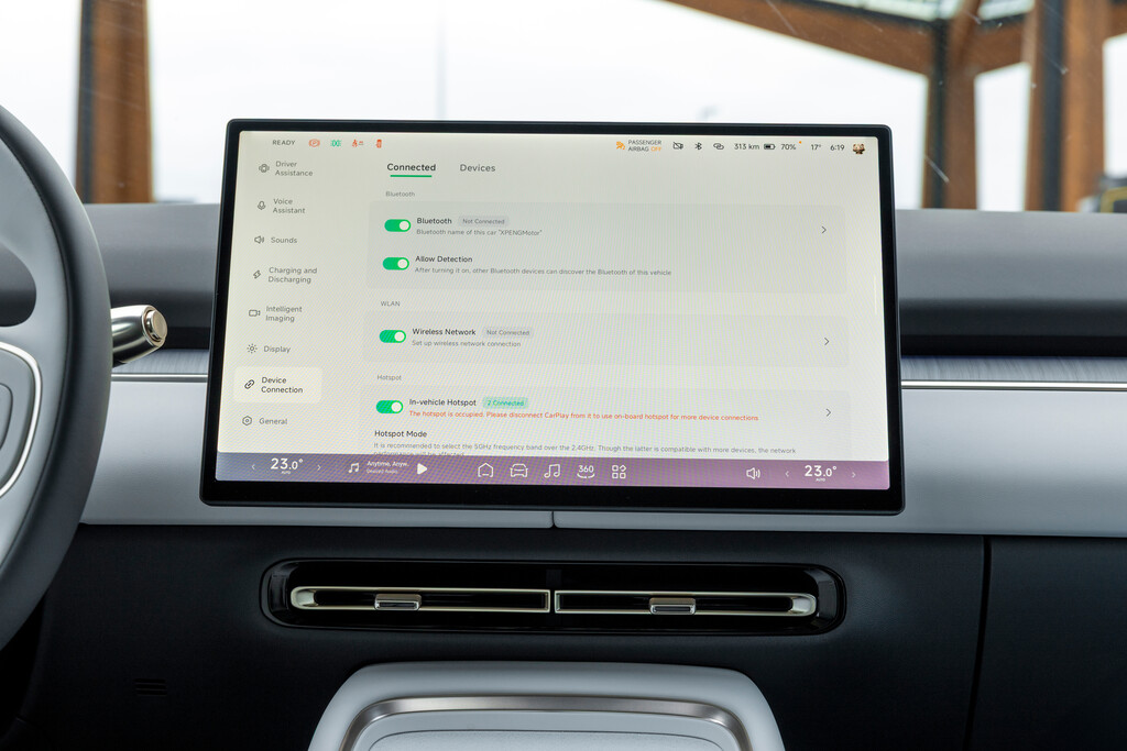 Im Cockpit herrscht der inzwischen etablierte Digital-Minimalismus. Ein 15,6 Zoll großer Touchscreen in der Mitte übernimmt fast alle zentralen Funktionen, dazu kommen ein sehr schmales 8,8-Zoll-Display hinter dem Lenkrad sowie erstmals ein großes Head-up-Display, das serienmäßig eingebaut ist. Letzteres ist ein Gewinn, weil alle relevanten Informationen direkt im Sichtfeld auftauchen. Manchmal allerdings auch zu viele, wenn an wuseligen Kreuzungen jedes Gefährt vor und neben dem Auto schematisch angezeigt wird. Auch bei Konnektivität und Komfortausstattung geizt Xpeng nicht. Apple CarPlay und Android Auto funktionieren kabellos, zwei Smartphones lassen sich induktiv laden, und die Serienausstattung fällt selbst in der Basis bemerkenswert komplett aus. Sitzheizung, Sitzlüftung, Massage, Panorama-Glasdach, Assistenzpaket, Sprachsteuerung – alles nicht als teure Verlockung im Konfigurator versteckt, sondern weitgehend schon serienmäßig an Bord.