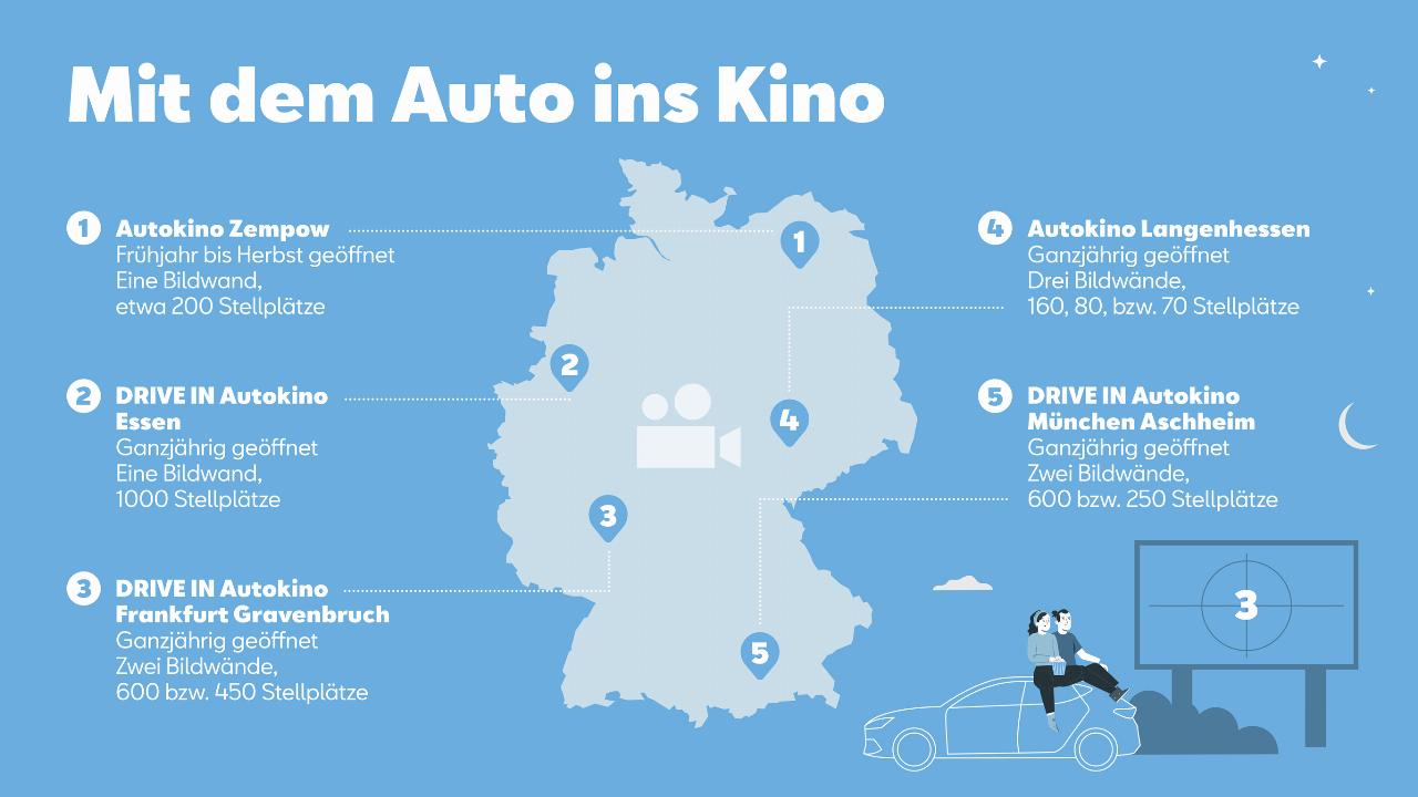 In Deutschland gilt das Autokino im hessischen Gravenbruch, das 1960 eröffnet wurde, als erstes seiner Art hierzulande und in Europa überhaupt. In der Gegend waren viele US-Soldaten stationiert, die sich als treue Kunden einfanden. 1966 folgte in Berlin-Siemensstadt ein zweites Autokino. In Hamburg öffnete 1976 das erste Autokino und überlebte bis ins Jahr 2003. Wer in der ehemaligen DDR ins Autokino wollte, der konnte ab 1977 nach Zempow (Wittstock/Dosse in Brandenburg) fahren. In ganz Deutschland gab es wohl insgesamt nie mehr als knapp 40 Autokinos.