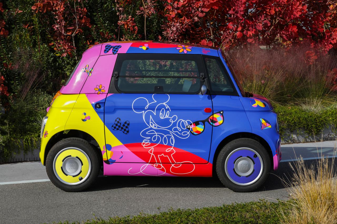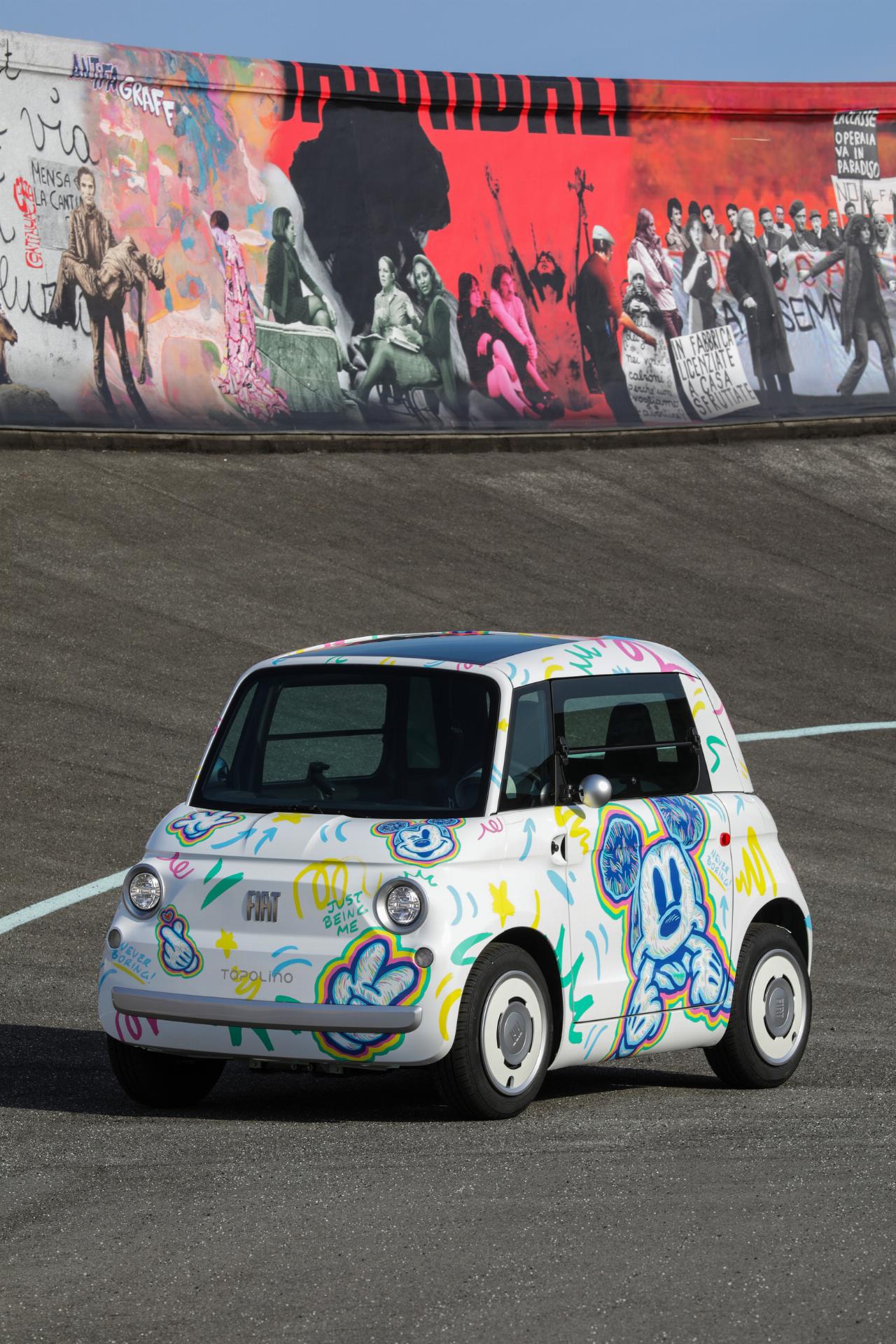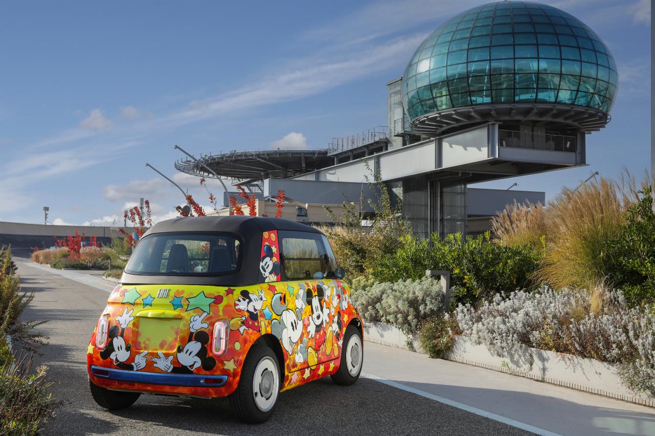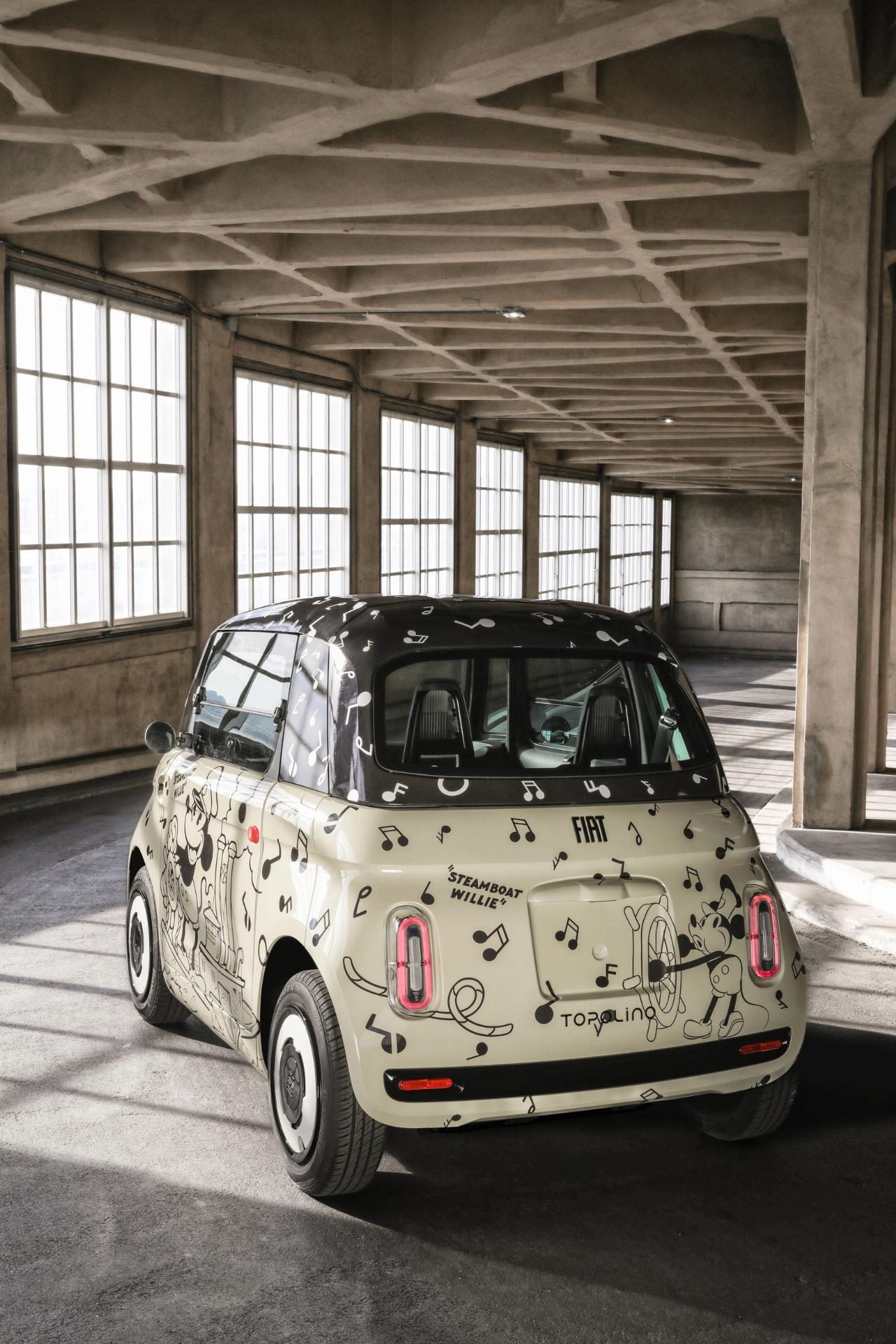 Ein weiteres Topolino-Unikat widmet sich der Historie und greift Motive des legendären Disney-Kurzfilms „Steamboat Willie“ auf, bei dem Micky Maus als Steuermann eines Raddampfers zu erkennen ist. Der dritte Wagen wurde dagegen von moderner Kunst inspiriert und trägt auf seiner Karosserie prominent die Initialen der Comicfigur. Die abstrakte Lackierung des vierten Topolino soll die Kreativität von Walt Disney symbolisieren, während das fünfte Modell das Thema Street Art aufgreift. Die mit reichlich Graffiti verzierte Karosserie soll die fröhlich-urbane Seite von Micky Maus unterstreichen.