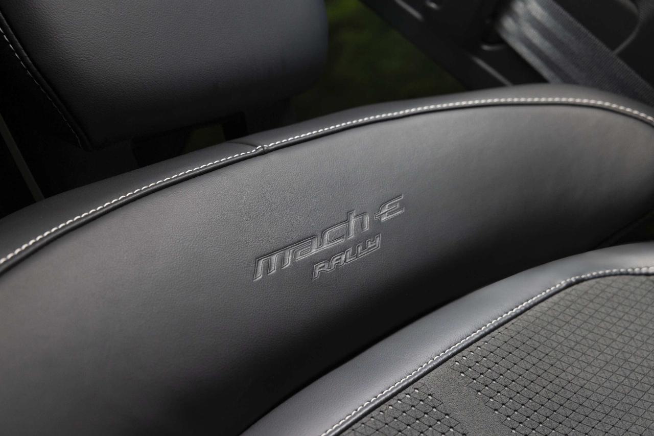 Vorne gibt es einen angepassten Frontspoiler und Nebelscheinwerfer im Rallye-Stil. Wie bei Wettbewerbsfahrzeugen weist die Bugschürze einen speziellen Befestigungspunkt für Abschleppseile auf. Zwei Rallye-Streifen, farblich auf die jeweilige Karosserielackierung abgestimmt, runden den Auftritt ab. Das Interieurdesign greift die Farbe der Felgen mit weißen Elementen für das Armaturenbrett, die unteren Speichen des Lenkrads und die Ziernähte der Türverkleidung auf. Auch die Sportsitze zeichnen sich durch glänzend weiße Einsätze für die Rücklehnen aus, deren Oberfläche zusätzlich noch „Mach-E Rally“-Prägungen erhalten. (aum)