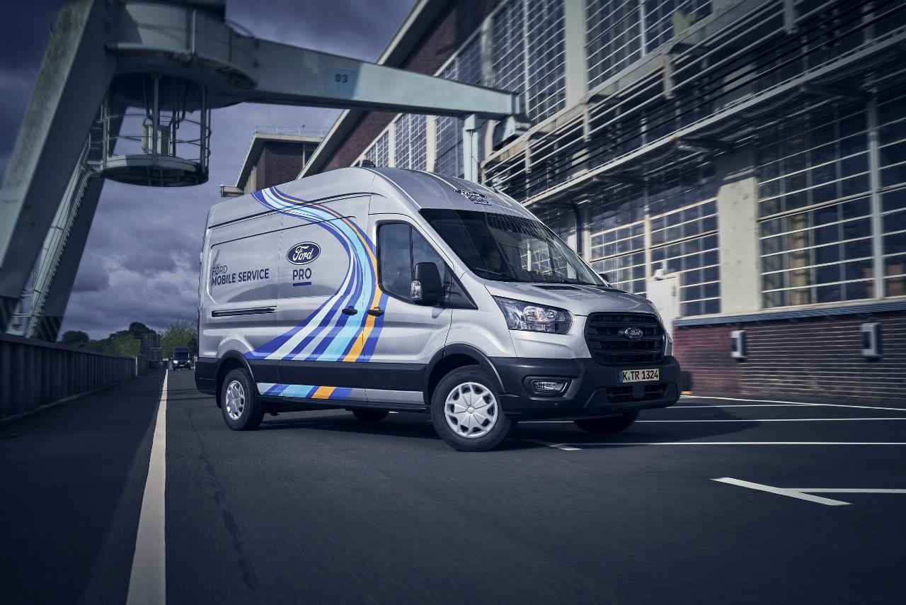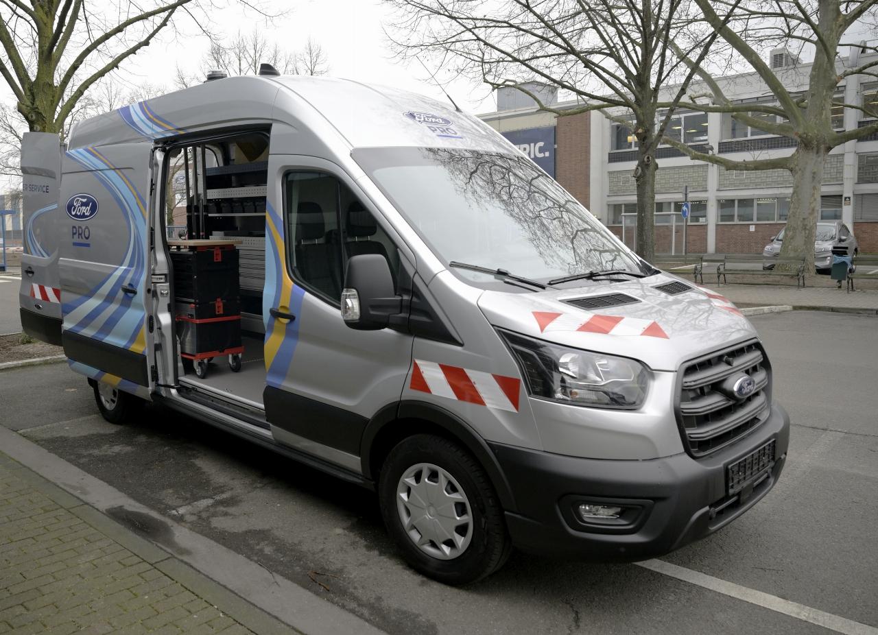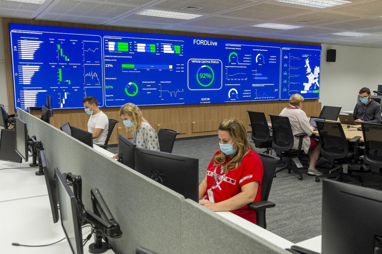 Um die Einsatzbereitschaft der Kundenfahrzeuge sicherzustellen, liefert eine neun mal zwei Meter große Videowand den Mitarbeitern von Ford Pro (für Produktivität) die benötigten Fahrzeugdaten. Die Informationen über den aktuellen Fahrzeugzustand werden von den Transportern und Pritschenwagen in Echtzeit über das serienmäßig eingebaute Modem geschickt und direkt an die Kölner Zentrale gesendet. Sollte ein Problem mit dem Fahrzeug auftreten, erhält der Fahrer im Cockpit einen Wartungshinweis in Form einer aufleuchtenden Warnlampe. Gleichzeitig bekommt der Fuhrparkleiter den gleichen Hinweis auf seinem Rechner, der sich dann an den Kölner Hersteller wendet.
