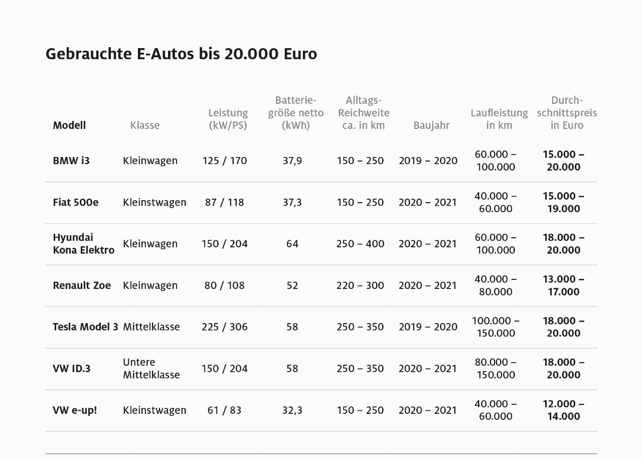 Größer ist die Modellauswahl bei den Fahrzeugen, die sich als Zweitwagen oder für Pendler besonders eignen. Diese haben je nach Modell häufig bereits eine realistische Reichweite von 150 bis 300 Kilometern, die Schnellladeleistung ist mit 40 bis 70 kW jedoch oft nicht mehr ganz zeitgemäß und für längere Strecken daher nur bedingt geeignet. Solche E-Autos gibt es je nach Alter und Laufleistung bereits für weniger als 15.000 Euro. Ein Beispiel ist der Renault Zoe, als eines der ersten Großserien-Elektroautos, aber auch andere frühe Elektroautos wie der BMW i3 fallen in diese Kategorie.