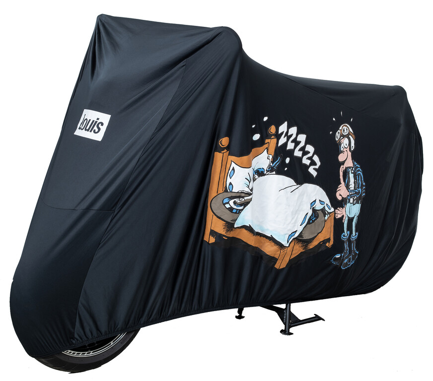Louis bietet eine neue Abdeckung für das Motorrad im Innenbereich an. Sie nennt sich passenderweise „Sleep“ und trägt auch einen entsprechenden Aufdruck. Das Motiv wurde gemeinsam mit Comiczeichner und Motorradfahrer Holge Aue („Motomania“) entwofern. Außen schützt das robuste Material vor Staub und Schmutz und an der Innenseite ist die Haube mit einer speziellen Beschichtung versehen, die den Lack des Motorrad schont. Die Sleep ist in zwei unterschiedlichen Größen erhältlich und passt sich dank elastischem Material und Gummizug gut an jedes Motorrad an. Zudem lässt sie sich leicht zusammenfalten. Der Preis beträgt 49,99 Euro für die Größe M (205 x 118 x 85 x 75 x 55 cm), in L (225 x 130 x 105 x 80 x 62 cm) sind es zehn Euro mehr. (aum)