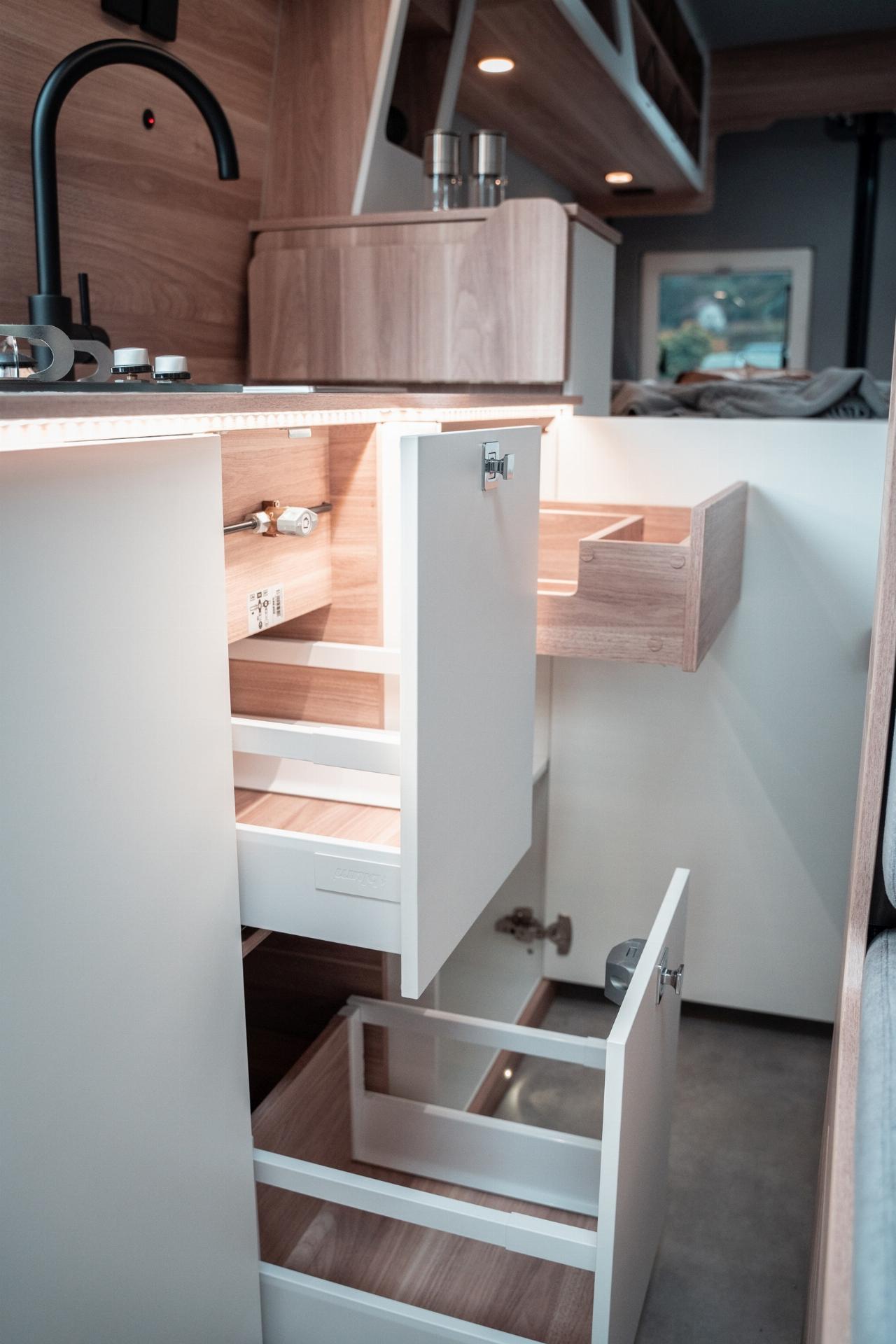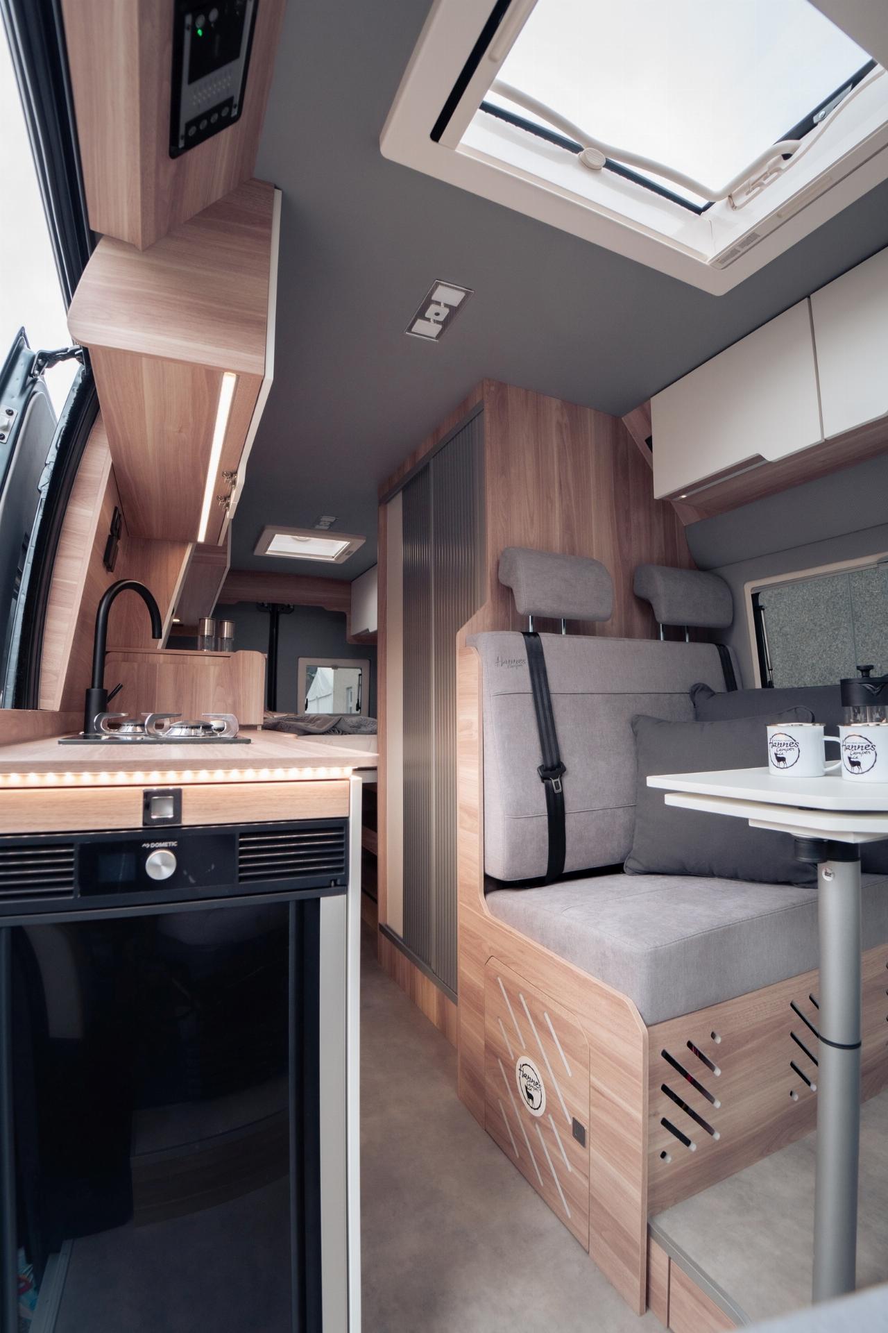 Beide Grundrisse mit Doppelquerbett bzw. Einzellängsbetten im Heck sollen mit ihrer Einrichtung gehobenen Hotelstandard bieten. Mattschwarze Edelstahlarmaturen, ein zum Teil dimmbares Lichtkonzept, Leichtbaumöbel und exklusive Textilien, der Mix aus offenen und geschlossenen Schränken, sowie das Premium-Baddesign mit einem Echtglas-Waschbecken stützen diesen Eindruck. „Wir konnten diese Plastik-Waschbecken und -Armaturen nicht mehr sehen“, begründet Geschäftsführer Tim Aster die aufwändigen Einbauten. Mit ihnen positionieren sich die Camper aus Slowenien klar in der Premiumklasse. Ein großes Händlernetz will Aster nicht aufbauen, die Auslieferungen sollen bei den Vermietstationen der Marke in Helmstedt, Paderborn und Nürnberg ausgeliefert werden. Stattdessen bietet Hannes Camper eine 48-Stunden-Ersatzteil-Garantie. Der direkte Zugriff auf einzelne Möbelteile und technische Komponenten ermöglicht den schnellen Versand.