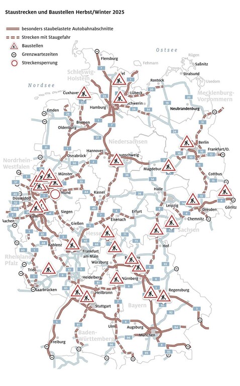 Ein besonderes Nadelöhr droht im Norden. Der Elbtunnel in Hamburg (A7) ist am Wochenende für 55 Stunden vollständig gesperrt. Urlauberinnen und Urlauber mit Ziel Nordsee sollten daher großräumig ausweichen. In Nordrhein-Westfalen sorgt zudem eine langfristige Sperrung für Behinderungen: die A59 bei Düsseldorf ist in Fahrtrichtung Köln ab sofort für acht Monate gesperrt.