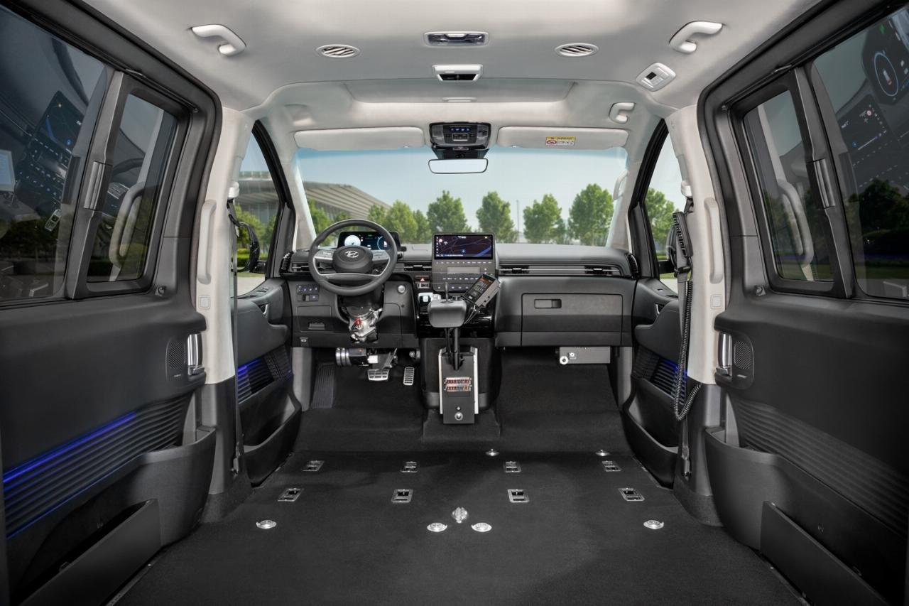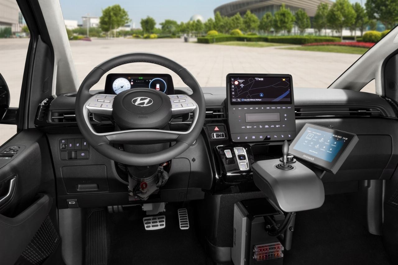 Um die nötige Kopffreiheit zu gewährleisten, wird beim Umbau der Fahrzeugboden des Staria von der A- bis zur C-Säule tiefergelegt. So entsteht ein barrierefreier Innenraum mit einer Höhe von 1,40 Meter, in dem neben dem Rollstuhl auch noch Platz für eine Sitzreihe für drei Personen ist. Der Großraumvan ist flexibel anpassbar und kann beispielsweise mit einem Kassettenlift und einer Transferkonsole von Paravan ausgerüstet werden.