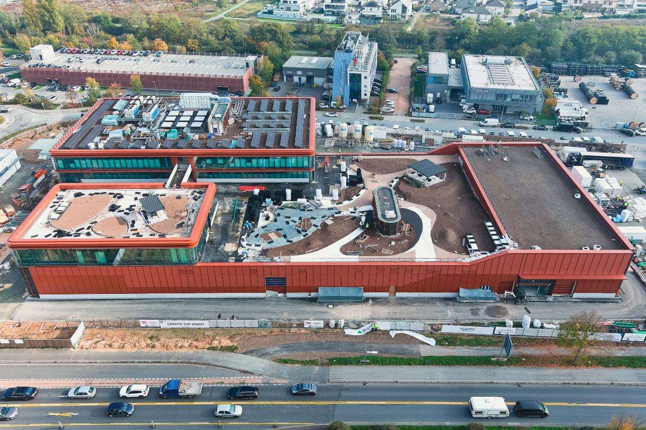 Der neue Gebäudekomplex wurde mit umweltfreundlichen Materialien, Photovoltaikmodulen und Wärmepumpensystemen errichtet. Es gibt hybride Arbeitsplätze, einen Dachgarten und besondere Voraussetzungen zur Förderung von Zusammenarbeit und Kreativität.