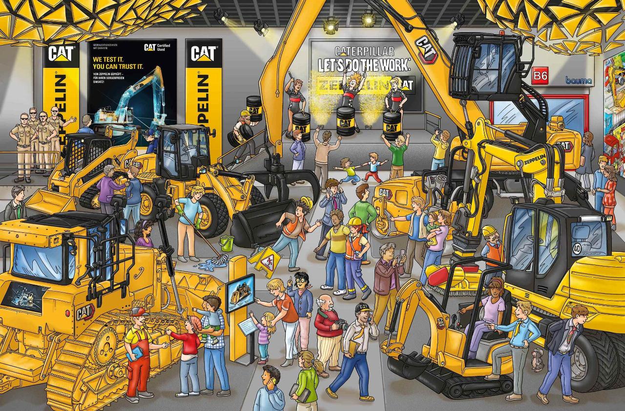 So genannte Wimmelbücher für Kinder stecken voller kleiner Details, die es auf Bildern zu entdecken gibt. Man kann gar nicht früh genug anfangen, mag sich auch die Werbeabteilung von Zeppelin Baumaschinen gedacht haben und hat mit Hilfe von Illustrator Max Walther die berühmten gelb-schwarzen Fahrzeuge von Cat(erpillar) in bunten Zeichnungen in Szene gesetzt.