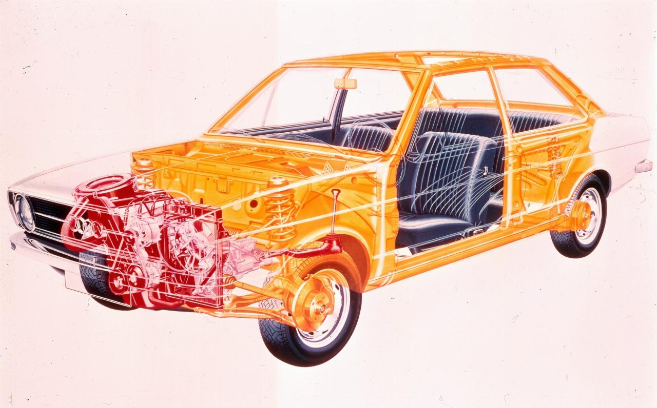 Das Design im Stil der neuen Sachlichkeit der 1970er-Jahre gestaltete Designer Hartmut Warkuß mit. Er stieg 1976 zum „Hauptabteilungsleiter Stilistik“ auf und prägt das Design der Marke übere mehrere Modellgenerationen. Das Basismodell mit zwei Türen wog lediglich 835 Kilogramm. Vorgestellt wurde der neue Audi im Juli 1972 nach den tragischen Olympischen Spielen in München. Seine Technik brachte zahlreiche neue Lösungen mit, die nach und nach auch in anderen Modellen des VW-Konzerns zu finden waren.