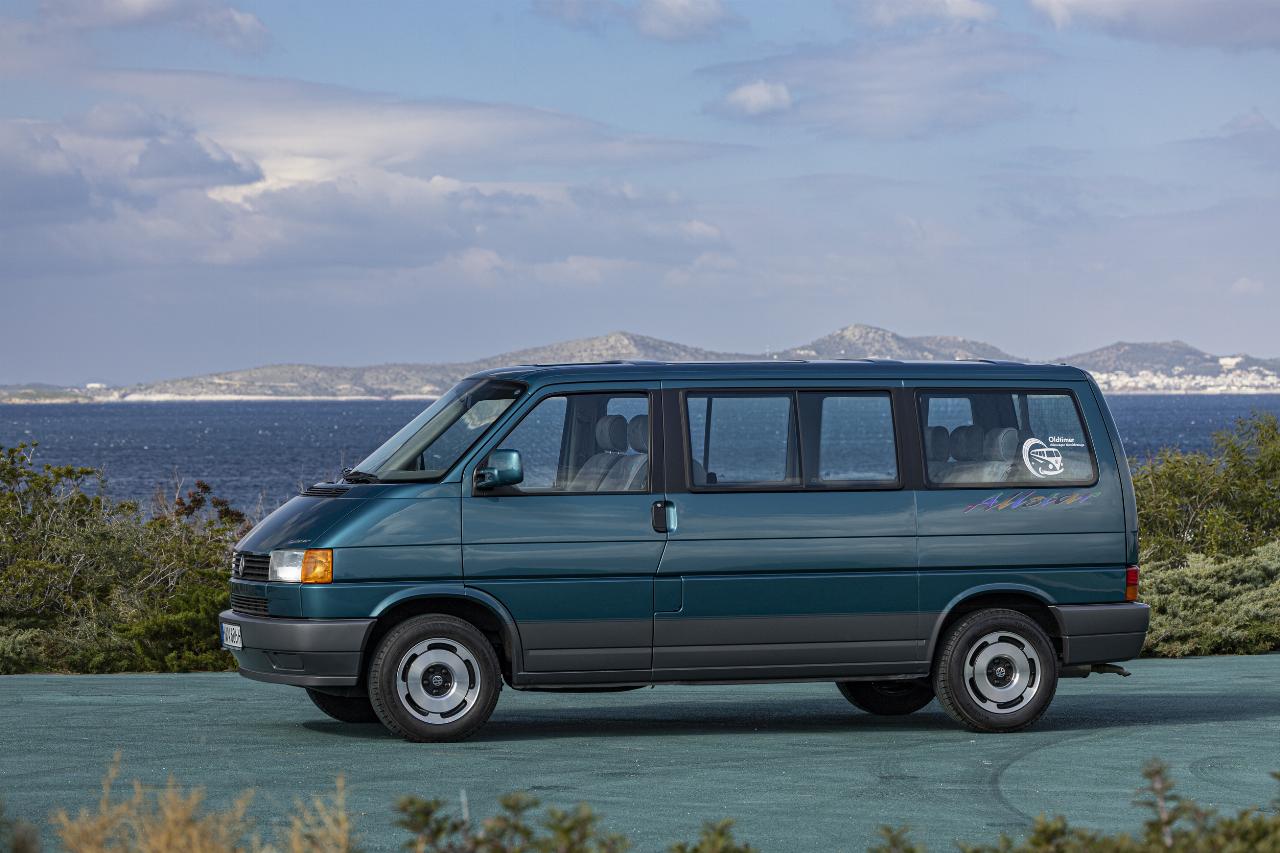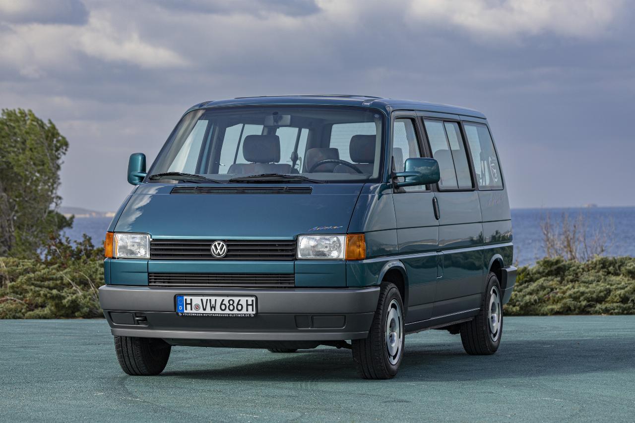 Mit der vierten Bulli-Generation vollzieht VW 1990 den technischen Wandel. Nach 40 Jahren Heckantrieb und -motor wird das Antriebskonzept komplett auf Frontmotor und Vorderachse umgestellt. An der groben Grundform sollte sich bis heute nichts mehr ändern. Der T4 wächst vorne, um dort die quer eingebauten Vier- und Fünf-Zylinder-Reihenmotoren unterzubringen sowie die Crashsicherheit zu erhöhen. Zum Marktstart gibt es wassergekühlte Benzin- und zwei Dieselmotoren mit Leistungen von 61 PS (49 kW) bis 110 PS (81 kW). Einen Syncro können Allradfreunde ab 1993 kaufen. Zwei Jahre später wird Volkswagen Nutzfahrzeuge (VWN) als eigenständige Marke im Konzern etabliert. Das wird 1996 mit einem umfassenden Update des T4 gefeiert. Als erster Turbodieseldirekteinspritzer (TDI) in einem VW Transporter zieht ein 2,5 Liter großer Fünfzylinder in den Bulli ein. Der längere Vorbau der Pkw-Varianten erlaubt zudem die Integration eines VR6-Benziners mit 2,8 Litern Hubraum. Der Top-TDI leistet ab 1998 beachtliche 151 PS (111 kW), der Sechszylinder bringt es auf bis zu 204 PS (150 kW). Nach 14 Jahren Bauzeit und rund zwei Millionen gebauten Exemplaren ist 2003 Schluss.