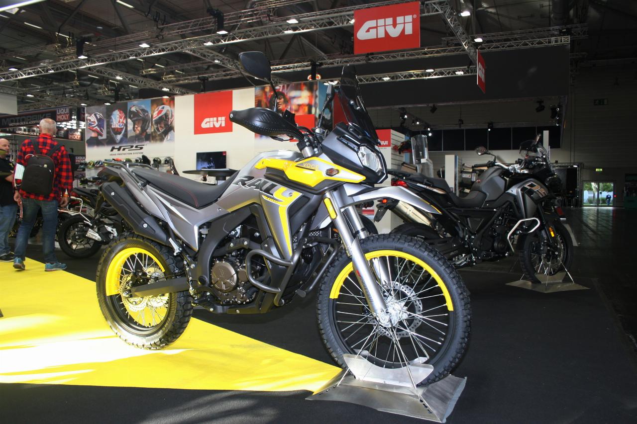 Die Honda CRF 300 Rally hat sich eine kleine treue Fangemeinde geschaffen. Mit einem Preis von über 7000 Euro spielt sie allerdings preislich zwei Klassen höher als Hubraum und Leistung nahelegen. Auf der Intermot in Köln (–9.10.2022) präsentiert Voge eine preisgünstige und hübsch gemachte Alternative, deren leicht hochgezogenes Heck fast schon trialartig wirkt. Die 300 Rally, wie sie schlicht heißt, kostet knapp 4600 Euro und schlägt die Honda mit knapp 29 PS (21 kW) sogar noch etwas in der Leistung, hat mit 25 Newtonmetern bei 6500 Umdrehungen in der Minute aber einen Hauch weniger Drehmoment. Die Einzylinder-Enduro mit 292 Kubikzentimetern Hubraum fährt vorne mit üppigen 21-Zoll-Rad vor (hinten 18 Zoll) und wiegt fahrfertig 158 Kilo. Die Sitzhöhe fällt mit 91,5 Zentimetern recht hoch aus.
