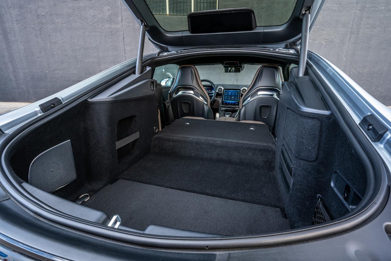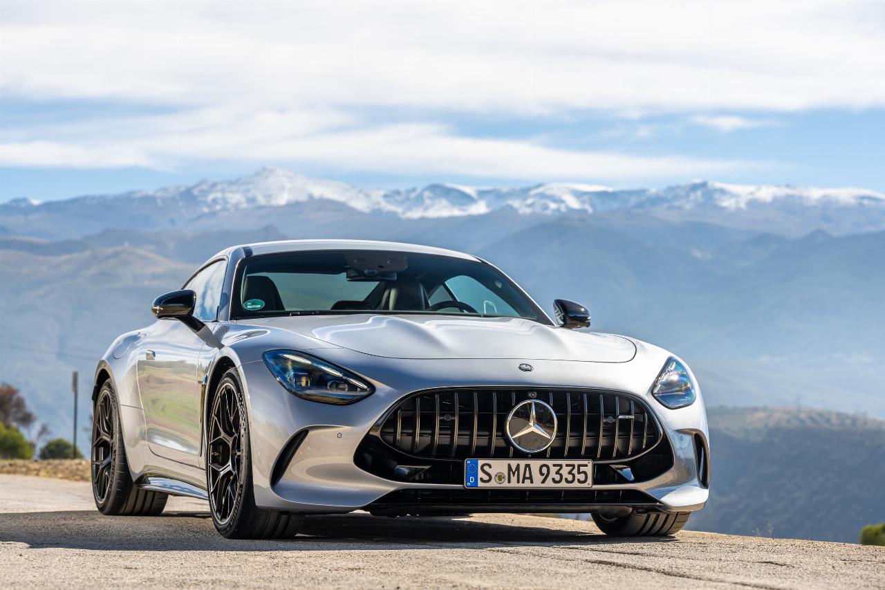 Im Vergleich zum bisherigen AMG GT sind die Proportionen etwas weniger extrem, aber das ist eher ein Vorteil: Man sitzt weiter vorn, das Auto ist übersichtlicher – und lässt sich damit auch auf der Landstraße noch präziser positionieren. Gegenüber dem SL hat AMG allerdings nachgeschärft, vor allem mit einer aggressiven, tiefer gezogenen Frontmaske. Das Interieur ist identisch – bis auf ein kleines Detail: Der im SL zur Vermeidung von Spiegelungen elektrisch neigungsverstellbare Zentralbildschirm ist hier fixiert.