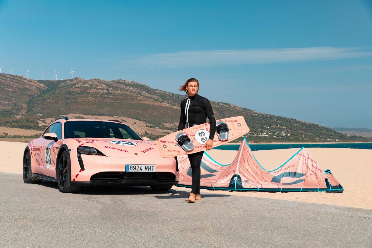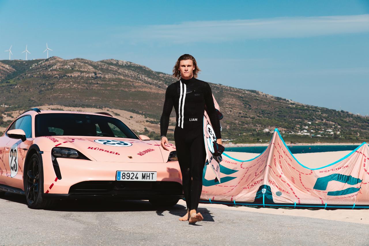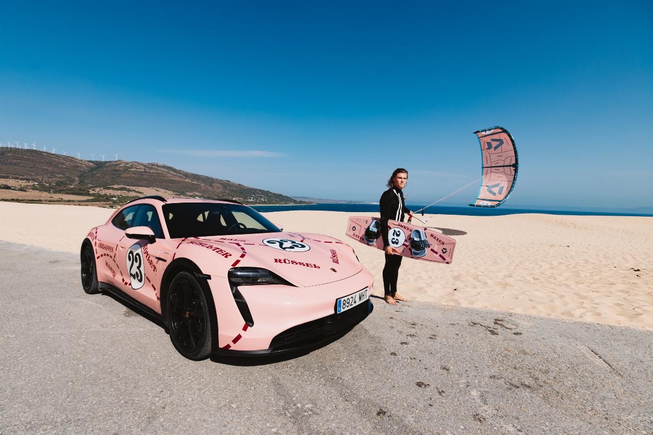 Im Farbdesign des Porsche 910/20 von 1971: Taycan 4 Cross Turismo und Kitesurf-Sonderedition von Duotone.