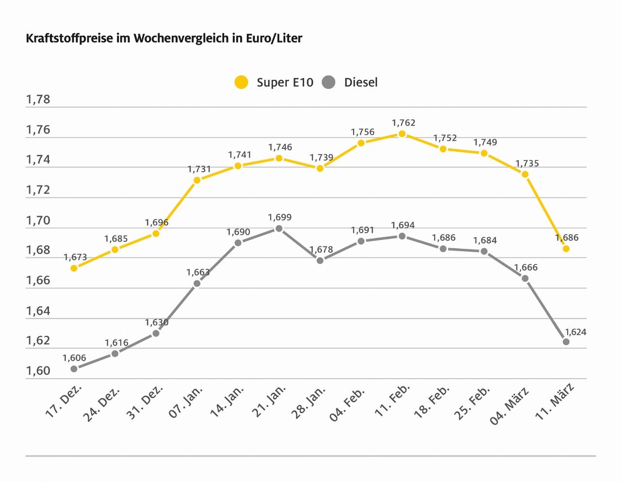 Tanken ist gegenüber der Vorwoche deutlich billiger geworden und die Preise sind so niedrig wie noch nie im Jahr. Nach Angaben des ADAC kostet ein Liter Super E10 im bundesweiten Mittel 1,686 Euro. Das sind 4,9 Cent weniger als vor einer Woche. Der Dieselpreis ging um 4,2 Cent zurück und liegt aktuell im Schnitt bei 1,624 Euro. Nach Ansicht des ADAC war der Preisrückgang überfällig, da sich Rohöl zuletzt deutlich verbilligt hat und der Euro gegenüber dem US-Dollar höher notiert. (aum)
