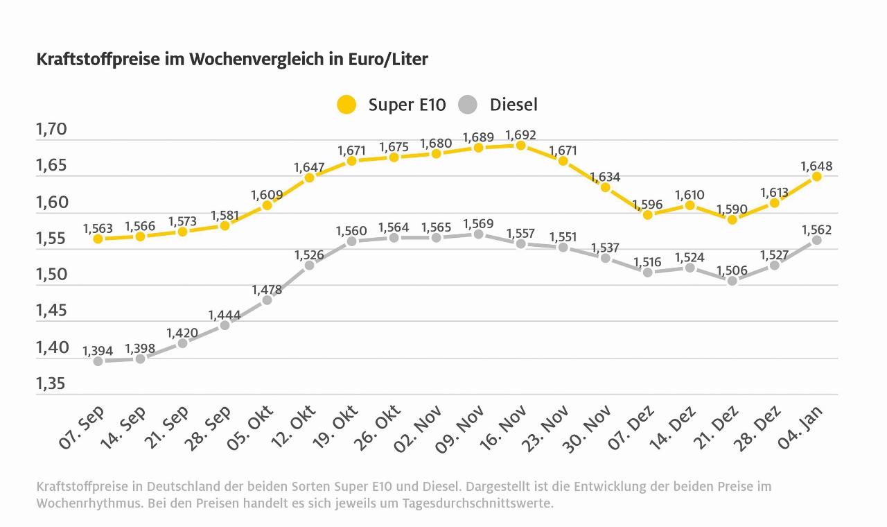 Seit Beginn des neuen Jahres hat sich die CO2-Abgabe auf Kraftstoffe erhöht: Dass verteuert den Kraftstoff laut ADAC rechnerisch um rund 1,5 Cent je Liter. Zum aktuellen Anstieg der Kraftstoffpreise habe aber auch der leichte Anstieg der Rohölnotierungen beigetragen.