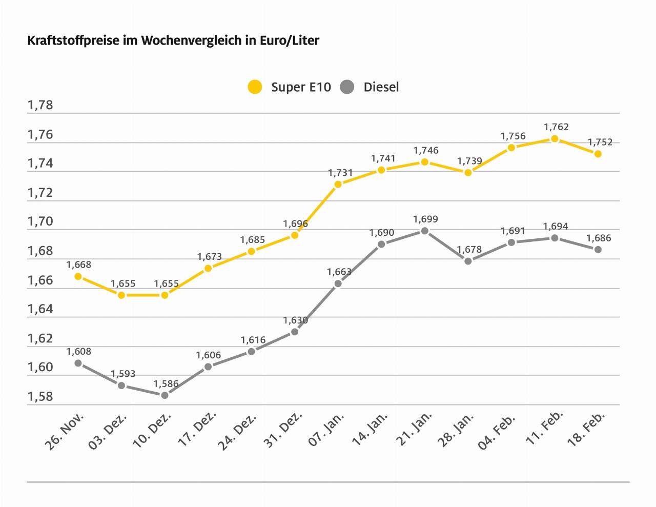 Die Kraftstoffpreise sind gegenüber der Vorwoche etwas zurückgegangen. Wie der ADAC ermittelt hat, kostet ein Liter Super E10 im bundesweiten Mittel 1,752 Euro. Das ist ein Cent weniger als vor sieben Tagen. Auch Diesel ist günstiger als in der Vorwoche. Für einen Liter müssen die Autofahrer im Schnitt 1,686 Euro bezahlen und damit 0,8 Cent weniger.