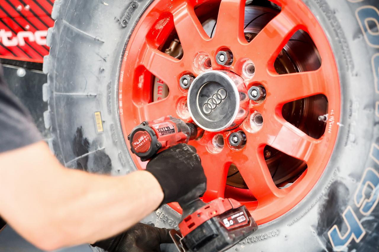 Die Audi-Piloten Mattias Ekström/Emil Bergkvist, Stéphane Peterhansel/Edouard Boulanger und Carlos Sainz/Lucas Cruz dürfen sich auf ihre neuen Arbeitsplätze freuen. Weiterhin liegen die Displays im gewohnten Stil im Sichtfeld des Fahrers und in der Mittelkonsole, ebenso bleibt das zentrale Switchpanel mit seinen 24 Feldern erhalten. Die Ingenieure haben die Anzeigen und Bedienelemente jedoch neu strukturiert. Deutlich erleichtert können die Besatzungen nun nach einem Reifenschaden arbeiten. Einfache, flache und leicht entfernbare Karosseriebauteile ersetzen die bisherigen voluminösen Abdeckungen der Ersatzräder in den Flanken. Die neuen Zehn-Speichen-Felgen von Partner Rotiform sind deutlich griffgünstiger.