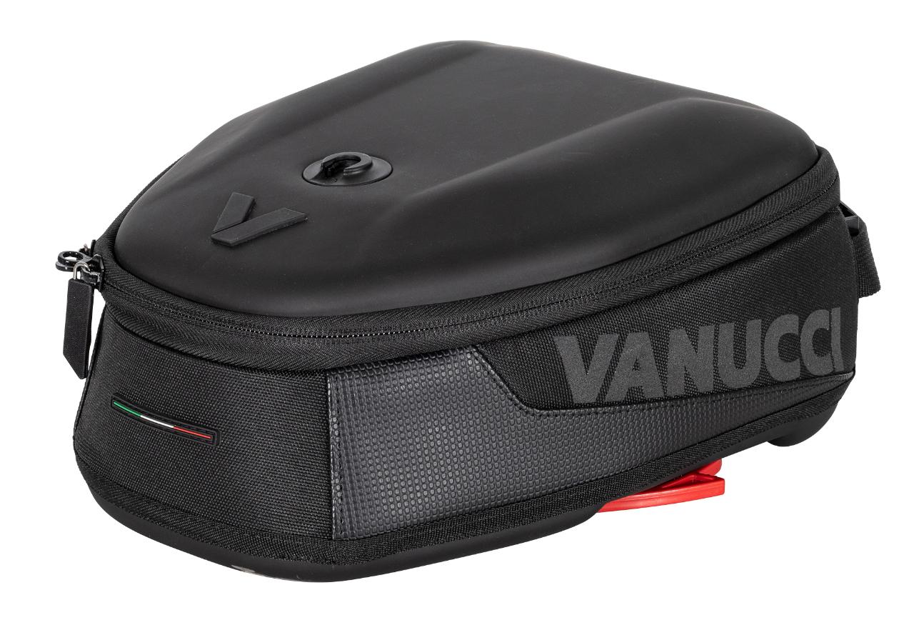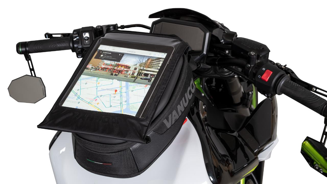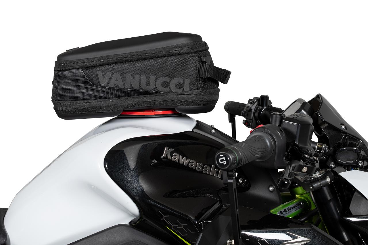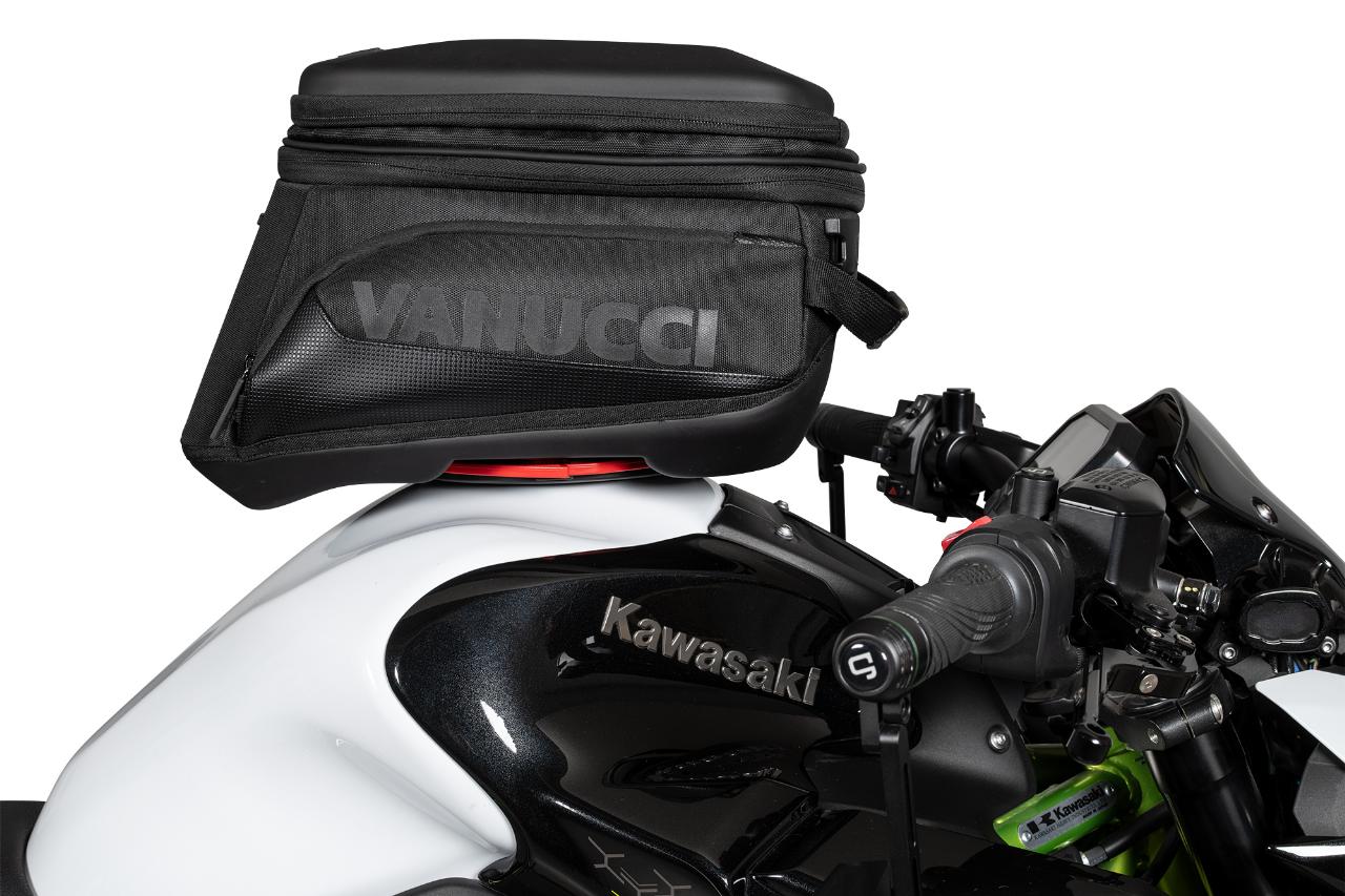 Die Preise bewegen sich zwischen 119,99 Euro und 199,99 Euro. Zusätzlich gibt es für alle Modelle zwei Aufsätze für Landkarte oder Tablet sowie fürs Smartphone. Vanucci weist die Tankrucksäcke nicht explizit als wasserdicht aus, aber wasserabweisendes Außenmaterial und ein zusätzlicher Innensack mit Rollverschluss sollen für ausreichenden Nässeschutz sorgen. Die Givi-Adapter für den Tank sind je nach Motorradmodell ab 12,50 Euro erhältlich. (aum)
