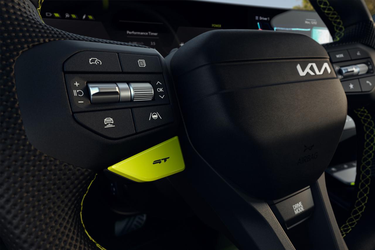 Wird statt der Launch Control der GT-Modus gewählt, beträgt die maximale Leistung 448 kW (609 PS). Der Kia EV6 GT ist 260 km/h schnell. Die Funktion „Virtual Gear Shift“ simuliert sowohl fühl- als auch hörbar die Gangwechsel. Im Innenraum finden sich am neugestalteten Lenkrad und an den Sportsitzen mit veganen Bezügen in Wildlederoptik die für den EV6 GT typischen neonfarbenen Akzente.
