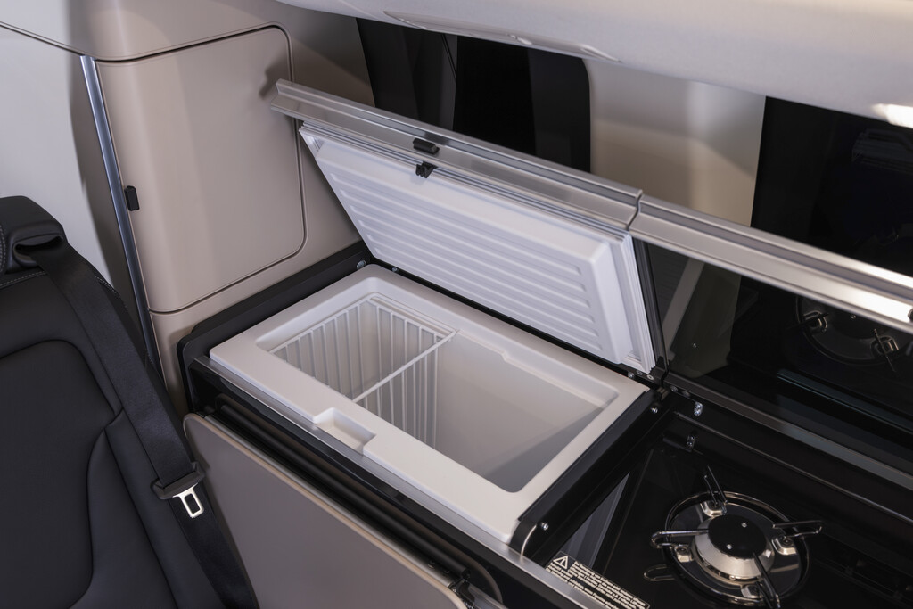 Herzstück der Bedienlogik bleibt das seit 2019 eingesetzte Mercedes-Benz Advanced Control (MBAC). In der neuen Ausbaustufe lässt sich nun auch das neue Schiebedach sowie die LED-Ambientebeleuchtung im Aufstelldach und das aktualisierte Soundsystem zentral steuern, entweder über das Headunit-Display oder per MBAC-App auf dem Smartphone. Der Vorteil liegt buchstäblich auf der Hand: Wer im Bett liegt, will nicht aufstehen, um Licht oder Dach zu bedienen. Zu den weiteren Optimierungen zählen verbesserte Klapptische, optimierte Schubladenführungen, ein überarbeitetes Bedienpanel an der Sitzbank sowie eine Kühlbox, die weniger Energie zieht.