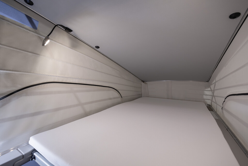 Deutlich wird das beim weiterentwickelten Aufstelldach. Es besteht nun aus einer robusten und zugleich leichten Aluminium-Doppelschale. Das ist nicht nur eine Materialentscheidung, sondern ein Versprechen in Richtung Wettertauglichkeit: Stabilität, Isolation, weniger „Draußen“-Gefühl, wenn es nachts abkühlt oder morgens schon die Sonne aufs Dach brennt. Dazu kommt ein im hinteren Bereich um zehn Zentimeter erhöhter Faltenbalg. Zehn Zentimeter sind im Stehen kaum der Rede wert, im Liegen und Aufrichten aber ein kleines Komfort-Upgrade, das sich jeden Abend und jeden Morgen bezahlt macht.